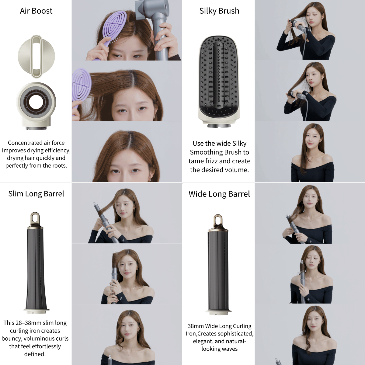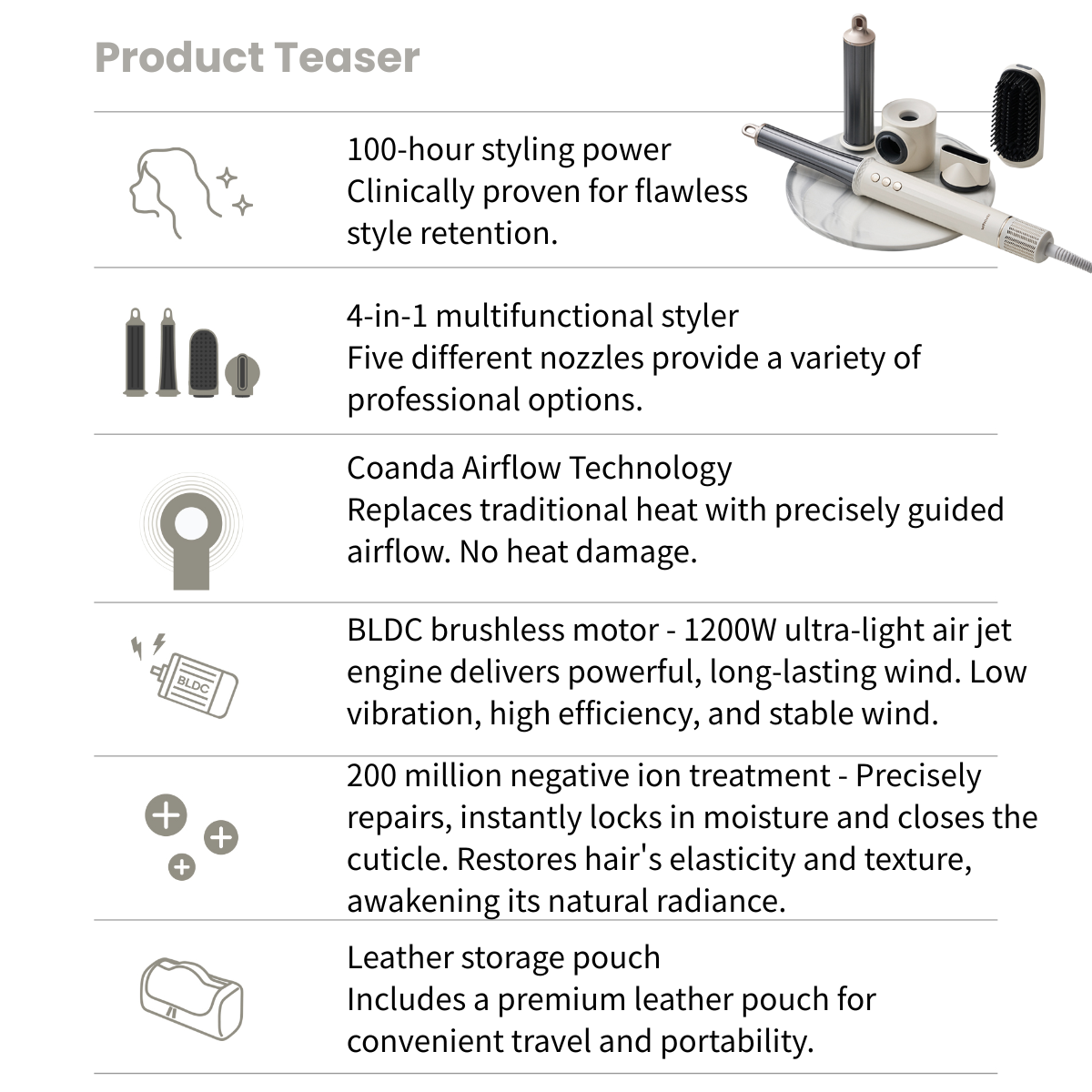 Coanda airflow technology provides gentle conditioning.100 hours of styling power.. The 4-in-1 styler with five nozzles allows for a variety of hairstyles. The BLDC motor provides powerful, fast drying. 200 million negative ions.