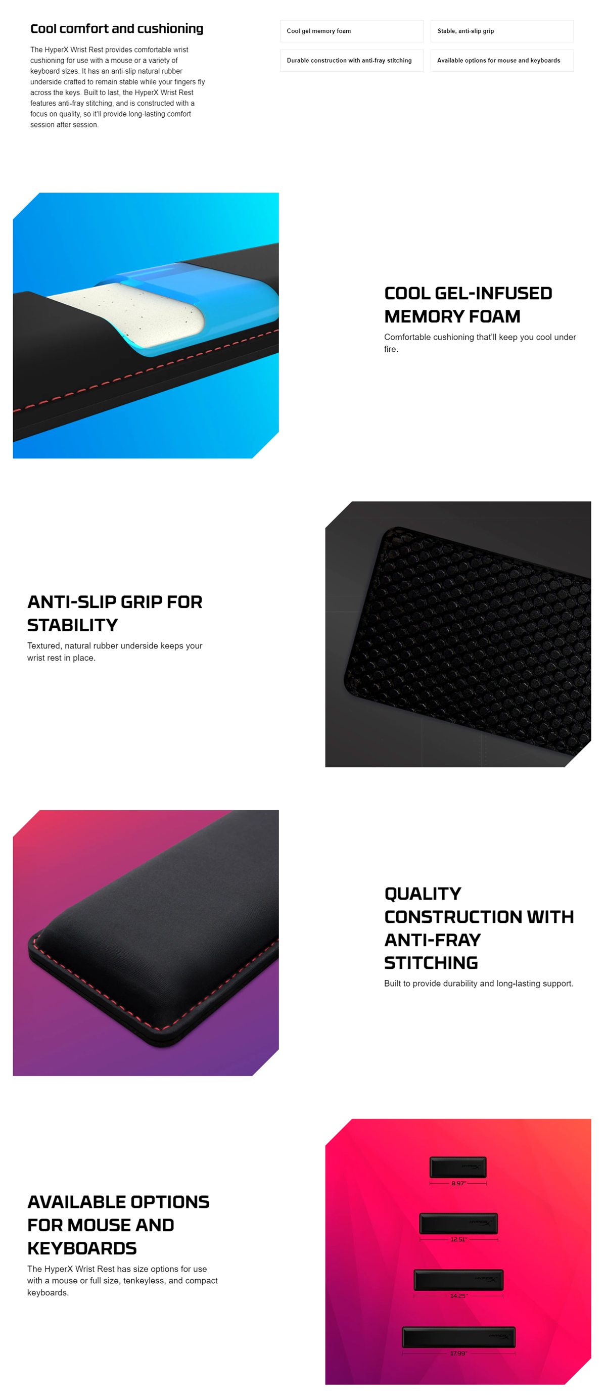 Cold gel memory foam,Non-slip bottom for stability,Durable construction and abrasion-resistant bezels,Ergonomically designed to fit with a full-size keyboard