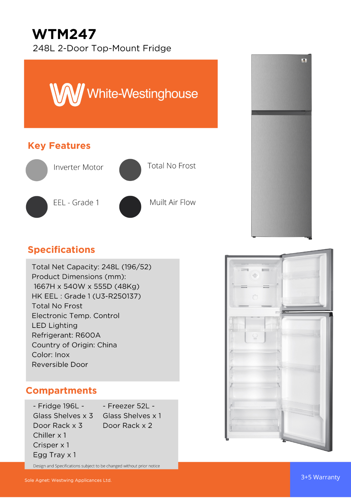 WTM247 248L Inverter 2-Door Top-Mount Fridge / No Frost / 540mm Width / EEL Grade 1 / Reversible Door