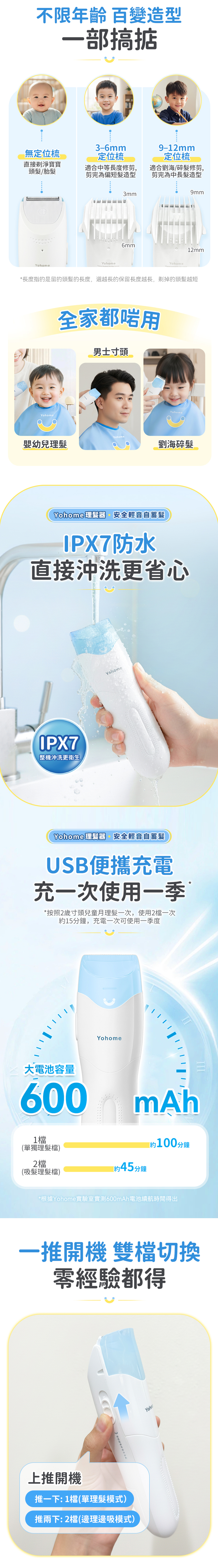 1. Noise level as low as 50dB 2. Front suction and rear storage prevent hair from flying away 3. Lightweight, weighing only 198g 4. Suitable for all ages, from baby hair to short hair 5. Passes CE / RoHS / IPX7 waterproof tests.