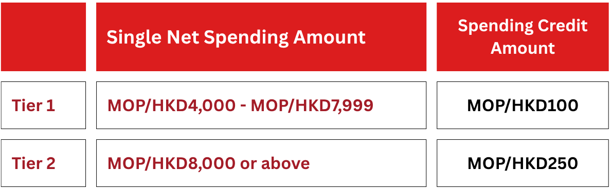 The maximum spending credit amount for each eligible customer from this promotion is MOP/HKD250. Each customer can only enjoy the reward ONCE only whether it is for Tier 1 or Tier 2 from this promotion.