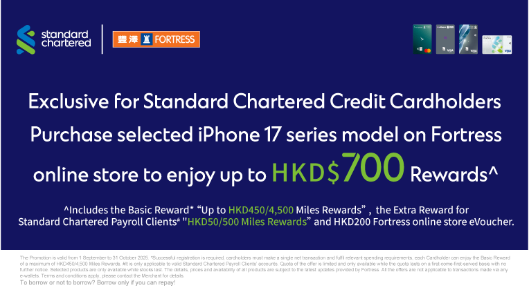 + Terms & Conditions of “Fortress Online Store Flash Deal” : The promotion period of the offer is valid from 1 October to 31 October 2025. The offer is applicable to Fortress online store only, and can be enjoyed in conjunction with “Spending Rewards“ and “Up to 50% off on Selected Products“. Unless otherwise specified, to be eligible for the Promotion, cardholders are required to make Eligible Transactions with credit cards issued by Standard Chartered Bank (Hong Kong) Limited, including Standard Chartered Credit Card and its Co-branded Card, MANHATTAN Credit Card and its Co-branded Card (except Standard Chartered Business Card and Standard Chartered Corporate Card) (the "Eligible Card"). The offer is NOT applicable to transactions made via any ewallets (including but not limited to Alipay, WeChat Pay and Tap & Go). Within the promotion period of this offer, cardholders log in at Fortress online store and purchase selected iPhone 17 Series or other selected iPhone model with the "Eligible Card“ and complete pick-up by 7 November 2025 can get an extra HK$200 Fortress online store eCoupon. The Fortress online store eVoucher will be credited to MoneyBack’ App member account used during the product purchase no later than November 21, 2025. The eVoucher will be valid till 20 November 2026. This eVoucher is non-returnable, non-refundable and non-transferable. Quota of the offer is limited and only available while the quota lasts on a first-come-first-served basis with no further notice. All products are limited in supply, while stocks last. The offer is provided by the Merchant, please contact the Merchant for any enquiries or disputes
