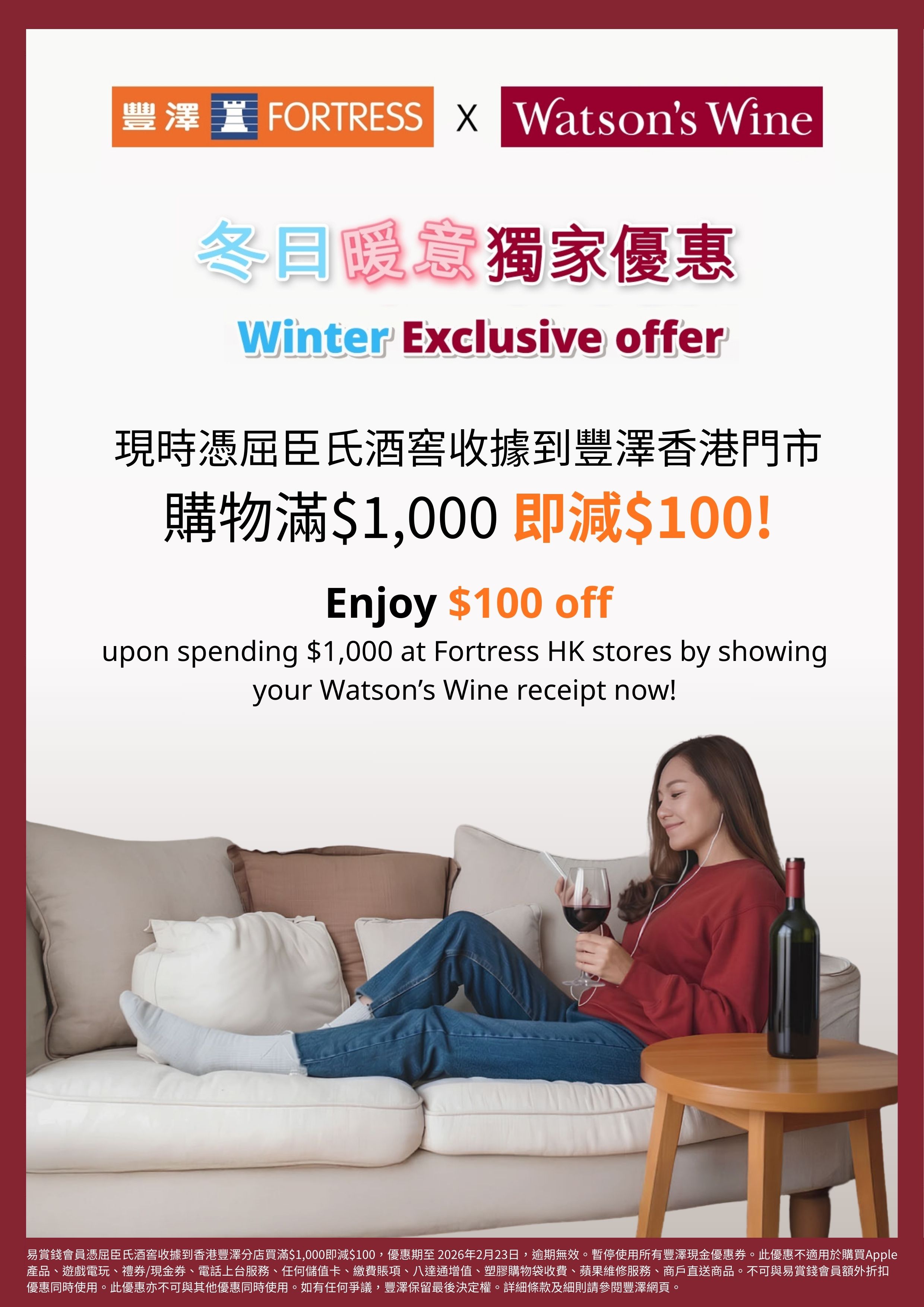 - MoneyBack members can use Watson’s Wine receipt or Watson’s Wine eShop Order history to enjoy a $100 discount on spending over $1,000 at Hong Kong Fortress stores. The offer is valid from Dec 15, 2025 to Feb 23, 2026.