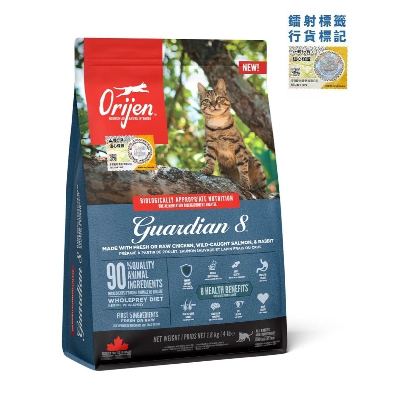 ORIJEN® Guardian 8 是一款营养丰富的猫粮,采用优质原料,专为解决猫咪常见的 8 种疾病而精心研制。由于本产品富含新鲜生鲜的 WholePrey 动物性食材,因此无需额外补充营养,即可终身呵护爱猫的健康。 Guardian 8 含有 90%* 的优质动物性食材,其中三分之二为新鲜生鲜,营养成分丰富,可从 8 个方面全面呵护爱猫的健康。这些益处包括:增强免疫力、促进消化、维持皮肤和毛发健康、维持肌肉健康、维持心脏健康、维持关节健康、促进大脑和认知功能以及维护眼睛健康。