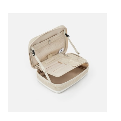 这款美容袋具有可调整容量的拉鍊设计,优化的储存空间,可调节的口袋,以及作固定用的顶部手柄,让它成为随时随地变成迷你化妆台。