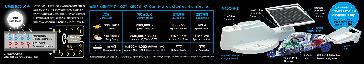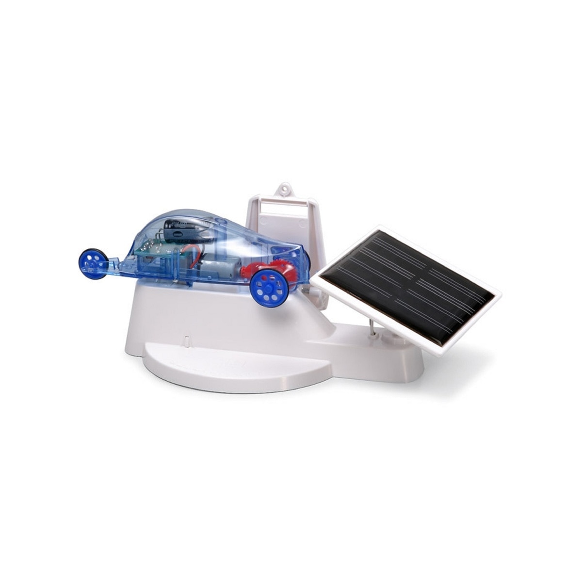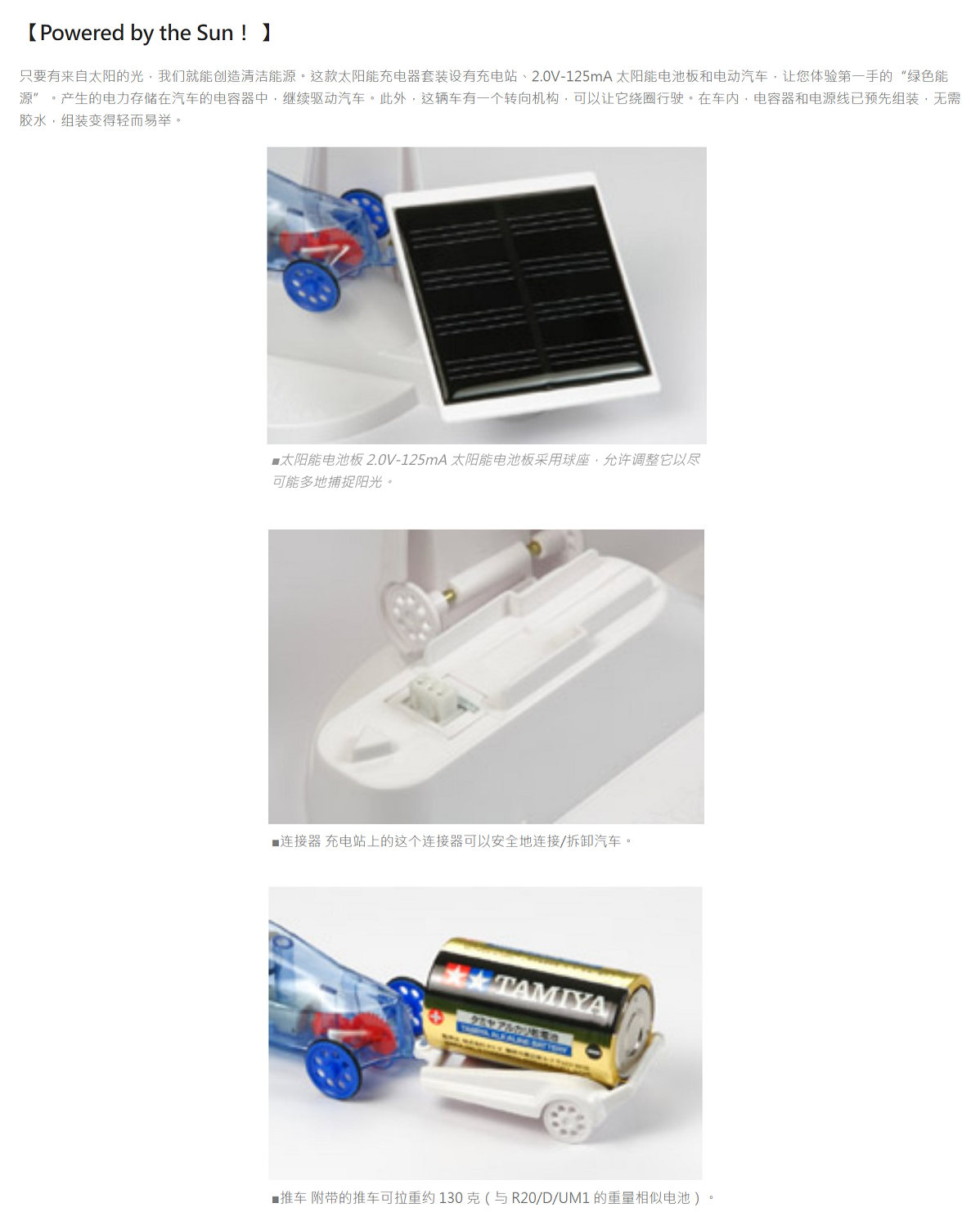 该太阳能发电机组非常适合幼儿和教育目的。太阳能电池板产生的电会充入安装在汽车模型中的电容器中。