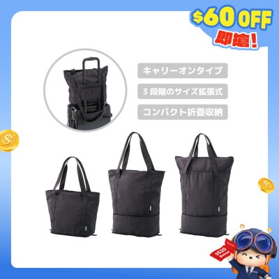 适合随身携带的旅行袋。利用旅行袋背面的开口,可以将旅行袋固定在行李箱的手柄上。容量可以作三个阶段扩展,因此即使在旅行中行李增多也无需担心。可压缩折迭,方便携带。