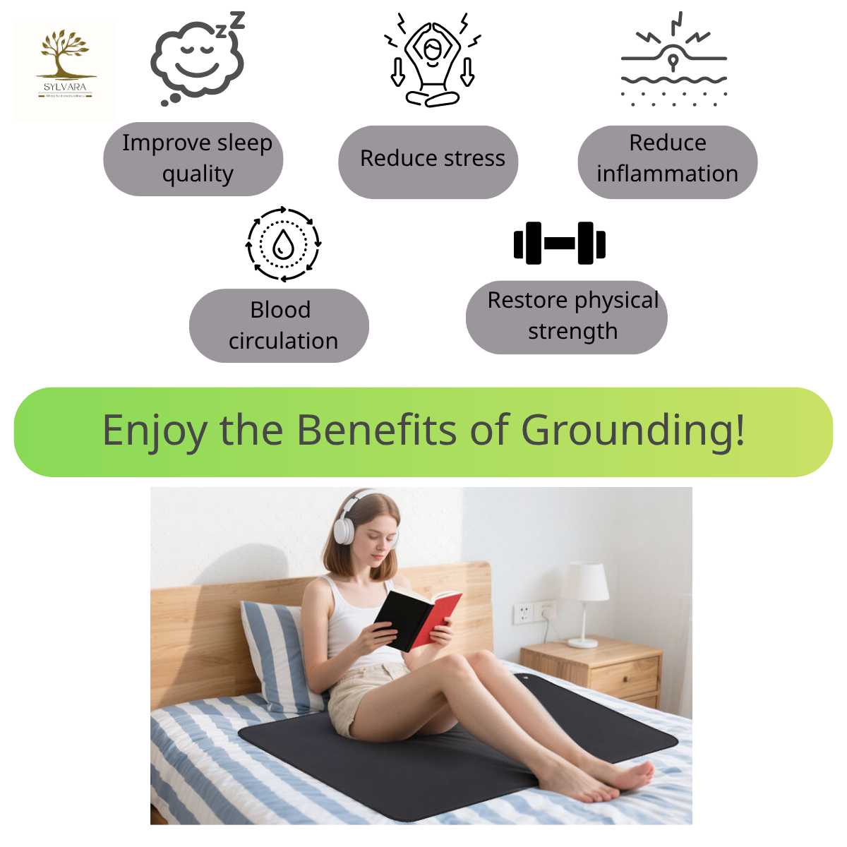 Sylvara接地垫配有专用电源线,一端为圆形插脚,可插入指定的接地孔,另一端透过特殊的卡扣连接到接地垫本身。优质物料:柔软vegan leather皮革 健康益处:改善睡眠,减轻炎症 用途广泛:可用作桌垫、瑜伽垫或睡眠垫 产品包括接地垫、连接线、香港三脚插头 尺寸: 60×90cm 不含Phthalates 塑化剂及重金属物质
