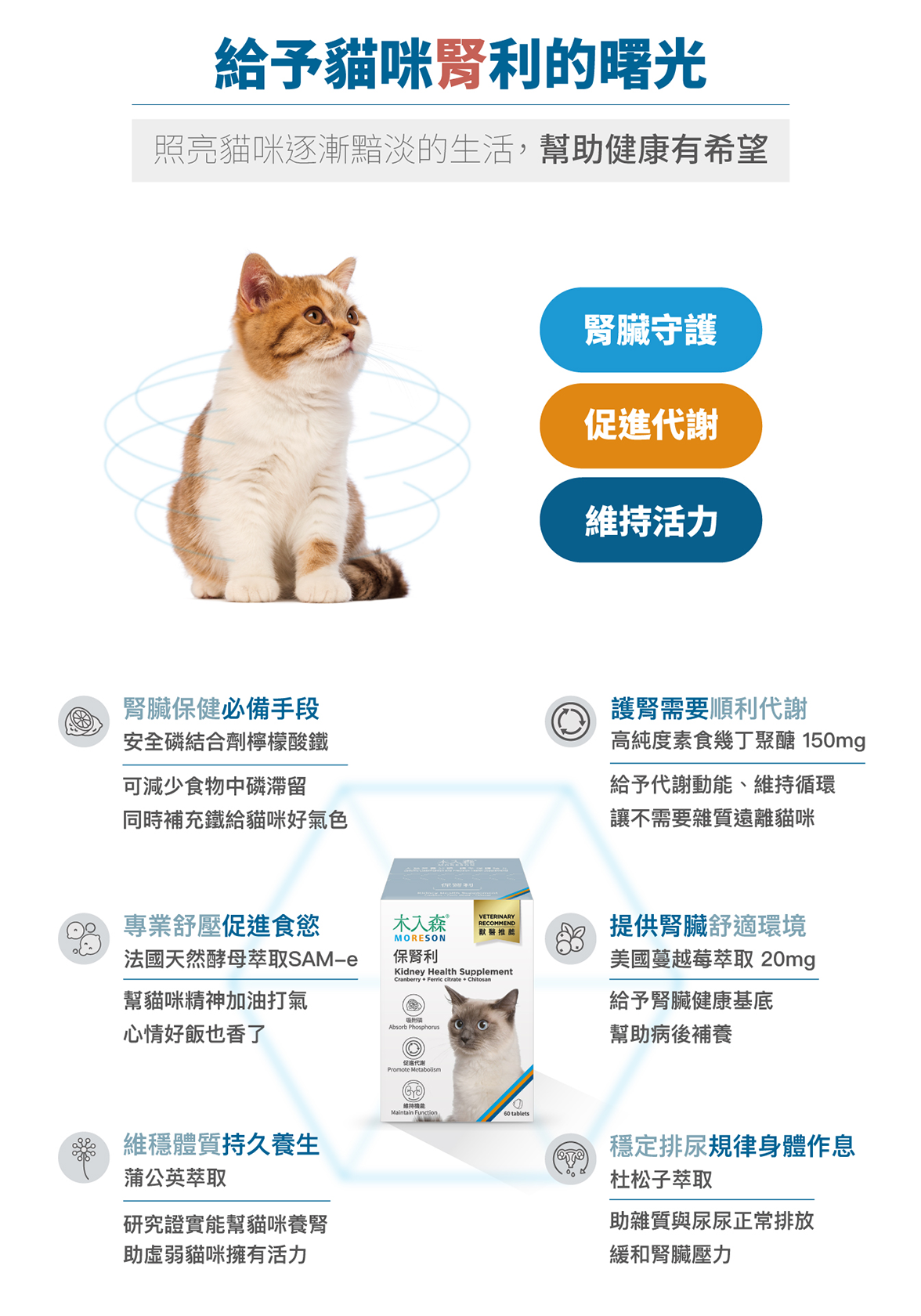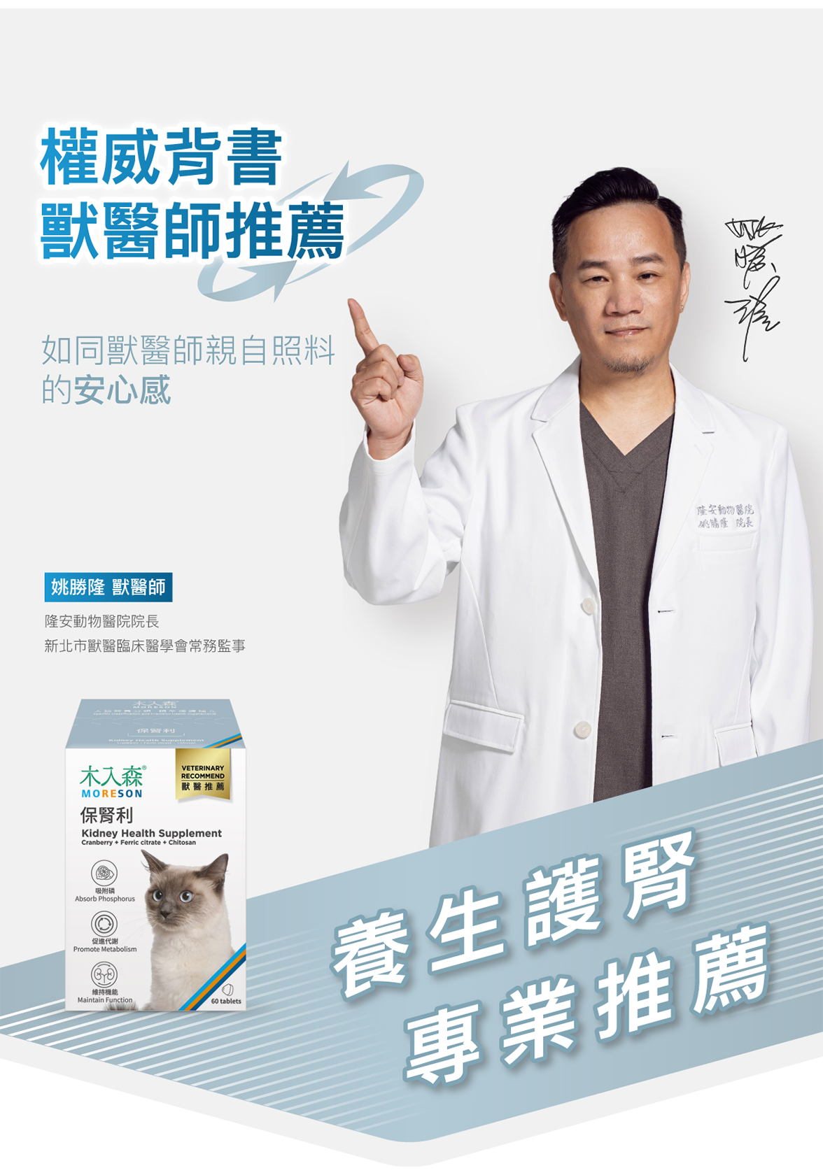 木入森猫咪保肾利|猫咪肾保健 主要成分 柠檬酸铁、几丁聚糖(洋菇来源)、酵母粉(含SAM-e)、蒲公英萃取物、微晶纤维素、蔓越莓萃取物、杜松子萃取物、肉粉(牛来源) 内容量 450毫克/颗;30颗/盒 食用方式 请拌入食物中喂食,或餐后立即给猫咪食用。若想超过建议剂量喂食,请先咨询兽医师。 建议量 5公斤以下猫咪每日保养1颗;加强2颗 5公斤以上猫咪每日保养2颗,加强3颗 保存期限 三年 有效期限 标注于外盒(西元年/月/日) 原产地 台湾 保存方式 请储存于干燥阴凉处;避免炎热、阳光直射。 注意事项 若有特殊疾病食用前请先询问兽医。本产品含植物萃取物,不含人工色素,如有色泽变化属自然现象,请安心使用。