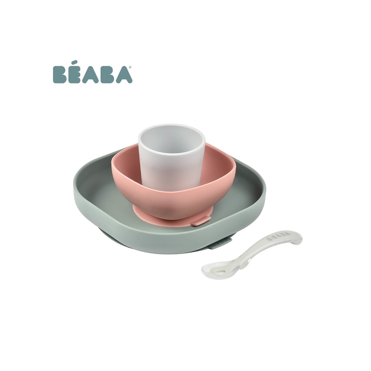 矽胶餐具包括一隻碟和一个带吸盘的碗,以及一个杯子(包括在套装中的矽胶第二阶段勺子)直向或横向扣,有助整理婴儿食物