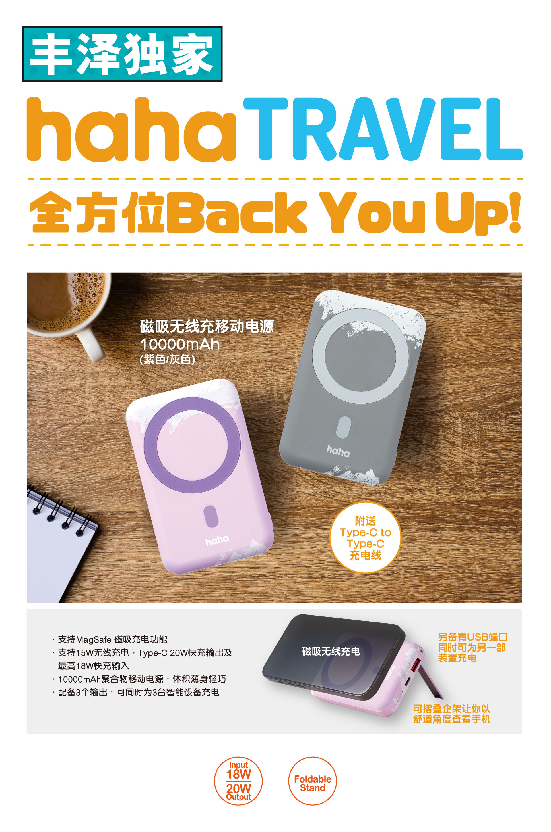 1) MagSafe 磁吸充電功能 2)15W無線充電 3) Type-C 20W快充輸出及最高18W快充輸入 3) 10000mAh聚合物移動電源,體積薄身輕巧 4) 配備3個輸出,可同時為3台智能設備充電
