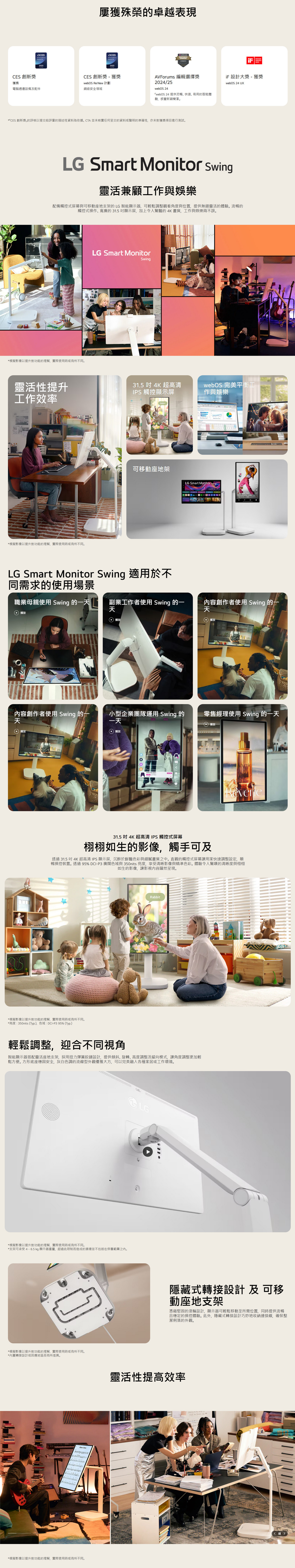 31.5 吋 4K 超高清 (3840x2160) IPS 触控式显示屏 支援倾斜、高度、旋转调节及纵向模式的可移动座地支架 webOS AirPlay 2、萤幕分享、蓝牙 3xUSB-C (1up/2dn, PD 65W)、2xHDMI 支援 Magic Remote 神奇遥控器及 Webcam (POGO) (需另行购买)