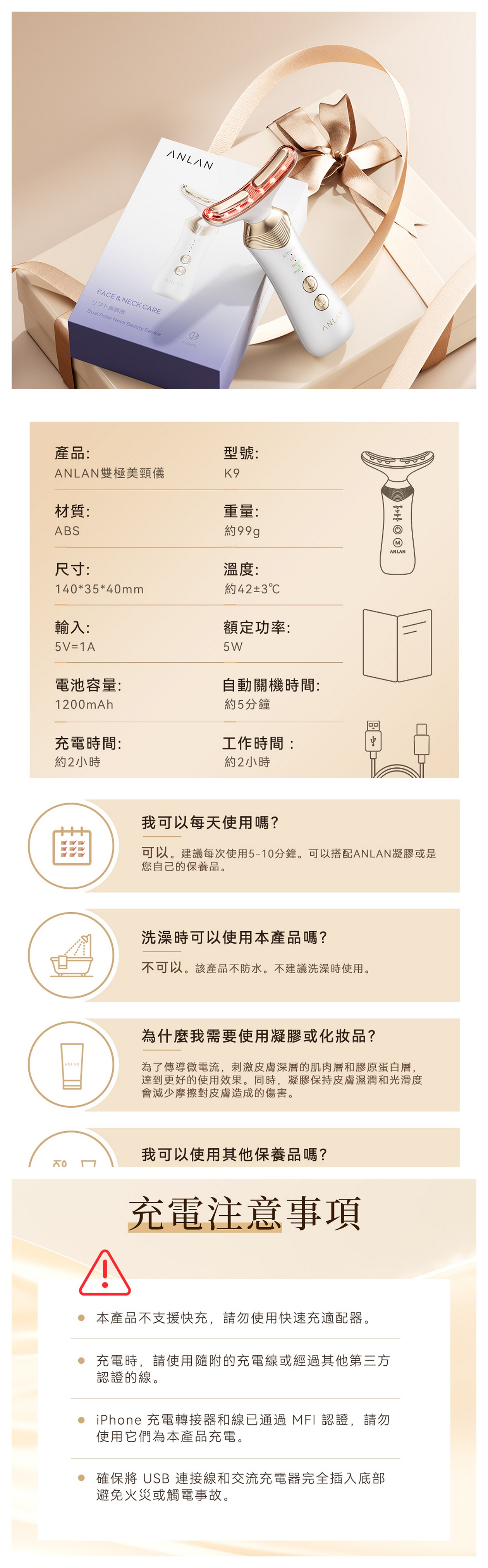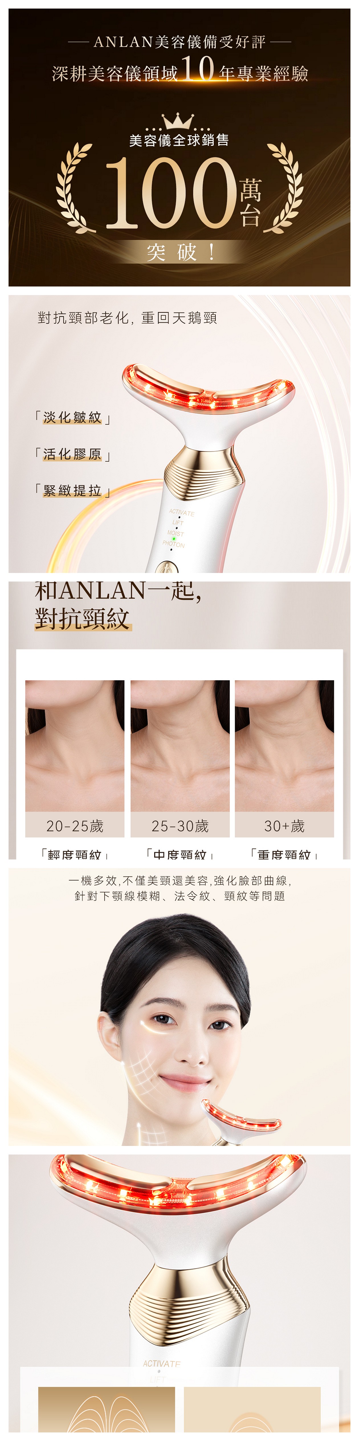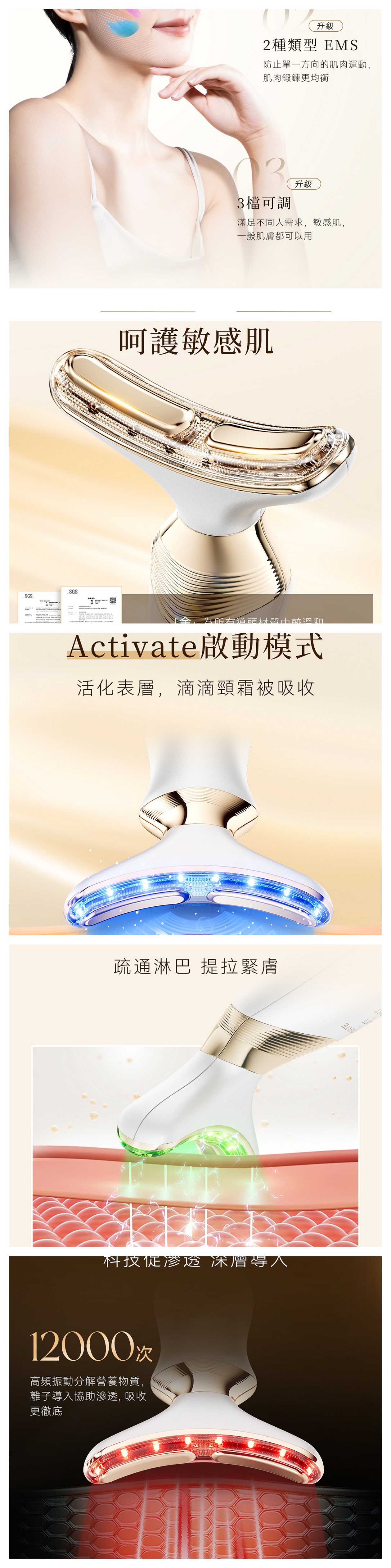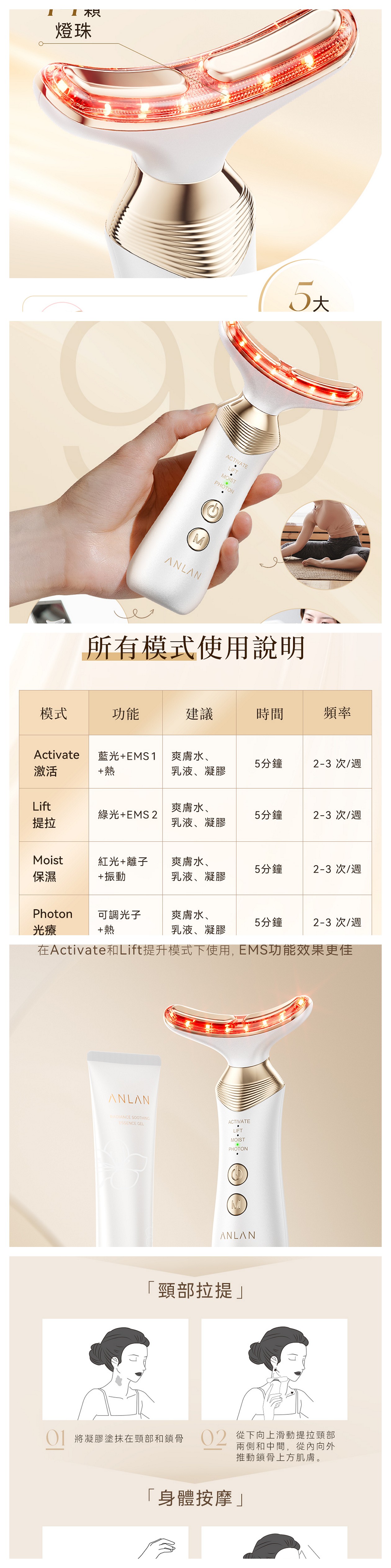 AMJY42-02A 追光双极美颈仪,集胶原激活、提拉紧致、导入保湿、光疗焕肤四大模式。配24K金双极探头与EMS微电流,结合五色光子及42°C温感科技,高频震动按摩促进吸收,颈脸兼用,有效改善颈纹与双下巴,重现紧致亮泽天鹅颈。