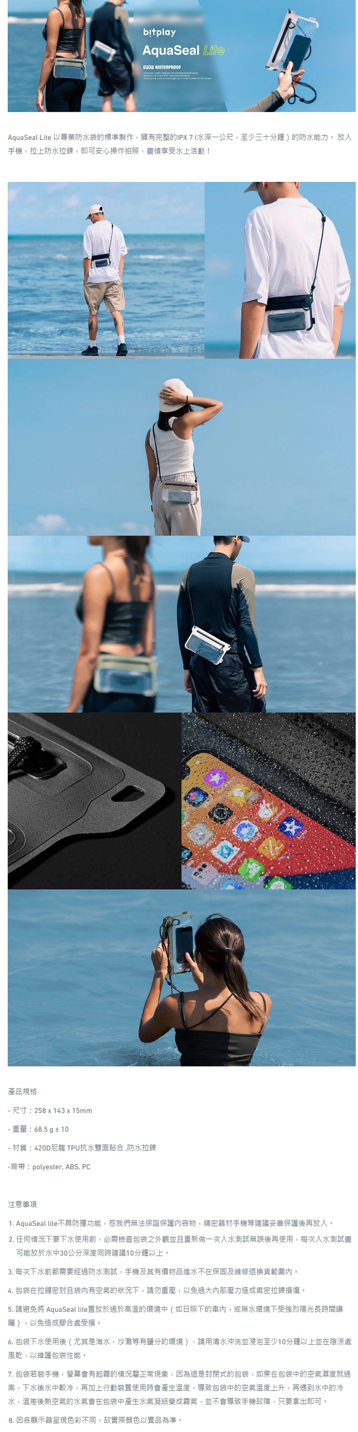 AquaSeal Lite 以专业防水袋的标准制作,拥有完整的IPX 7 (水深一公尺,至少三十分钟)的防水能力。 放入手机,拉上防水拉炼,即可安心操作拍照,尽情享受水上活动!