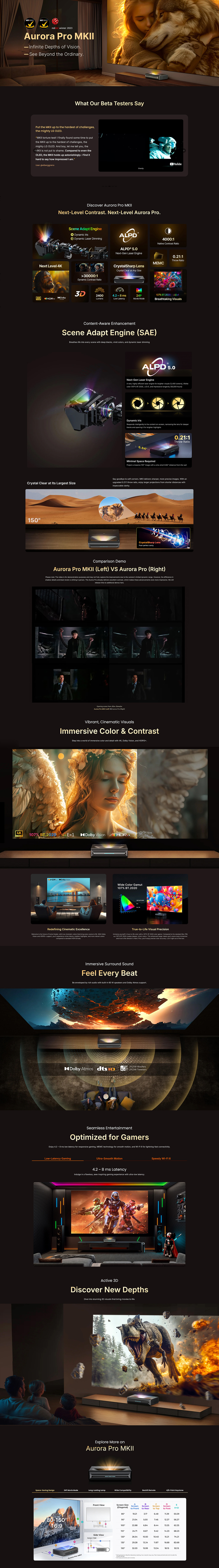 美国创新科技品牌NexiGo推出投影机新体验,打造高品质高体验的智能生活,Aurora Pro MKII採用新一代 ALPD® 5.0 镭射显示技术,4K UHD XPR解像度,亮度2400流明,大幅提升细节彻底消除了暗角,场景自适应引擎技术整合动态光圈与雷射调光,投射比例为0.21:1,动态对比:>30000:1,显着提升暗场细节还原能力。由Dolby Vision和HDR10+ / HDR10 / HLG 影片技术调整和优化影片,带您进入沉浸式色彩和细节的世界。