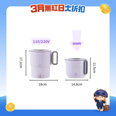 110V/220V 双电压设计,全球通用/极致轻巧的折叠式收纳设计(直径14.8厘米 x 11.5厘米)/智能煲水及保温:水沸时自动停止加热,自动切换至保温模式/电热煮食功能:可持续加热至190°C,适合各种料理/双层防烫设计:内层304不锈钢,外层PP材质/容量刻度标示(500ml/900ml),方便使用/可拆卸电源线及矽胶盖圈/体积小巧,适合放入20寸行李箱