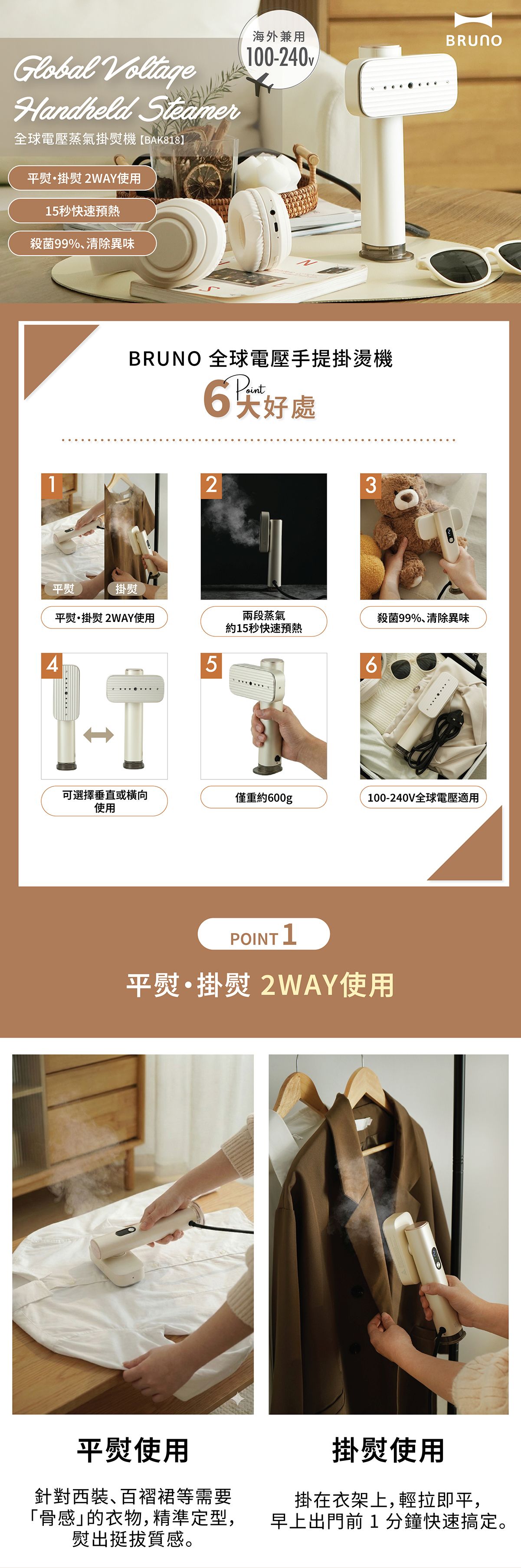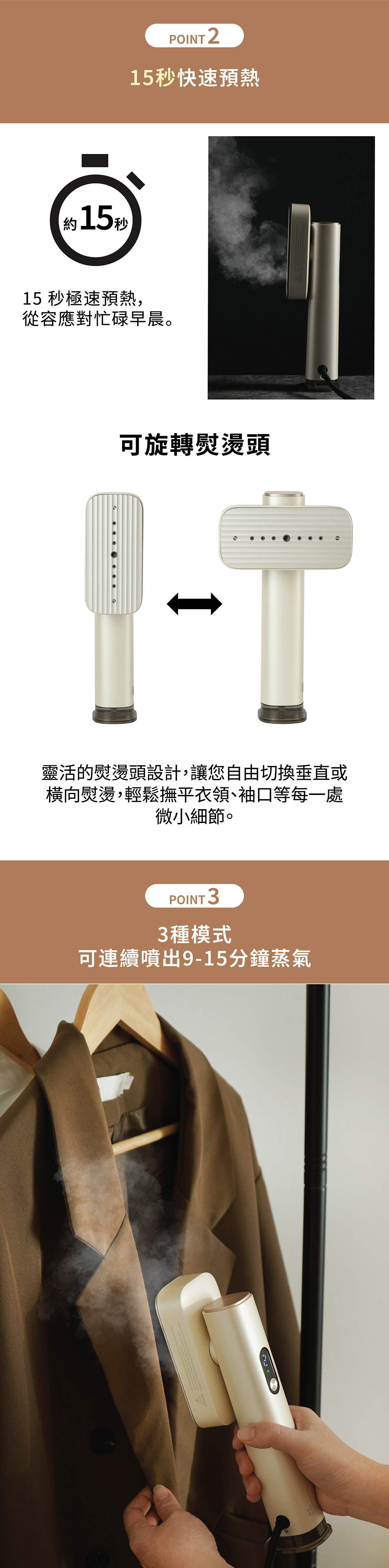 全球电压适用:支援宽电压,全球旅行轻鬆使用/快速预热:插电后约 15 秒即可完成预热/双重熨烫模式:可选择乾熨或蒸气熨 ,适用于不同布料和熨烫需求/两段蒸气选择:提供弱蒸气(档位 1)和强蒸气(档位 2)两段蒸气输出/可调节熨头角度:可依个人需求90°调整熨头角度,方便熨烫衣领或袖口等位置/水箱: 配备约 90ml 可拆卸水箱 ,强蒸气模式可连续输出约 9-10 分鐘/自动关机功能:产品在预热完成后,閒置 15 分鐘会自动关机 ,使用更安全