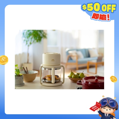 全透明耐热玻璃炸篮: 使用高硼矽耐热玻璃,烹饪时可随时观察食材熟成度,且清洁更为方便、不易残留异味/数码触控操作面板: 简洁的界面配备了预设菜单图示,能轻鬆自订温度与时间/多重安全防护: 内置安全开关,拉出炸篮会立即暂停运作。烹饪结束后,风扇会持续运转 30 秒以散热降温。底部设有加热器保护盖与矽胶止滑垫,提升使用稳定性/灵活存储设计: 主机可收纳于玻璃炸篮内,有效节省厨房存放空间