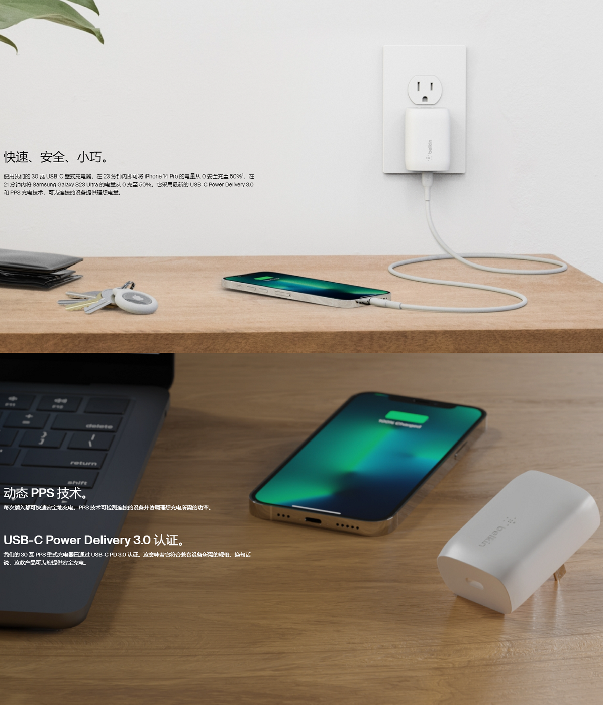 30W USB-C 家用式充电器能为 iPhone 和 Galaxy 装置充电。Power Delivery 3.0 和 PPS 技术两强联手,为连接的装置提供最适当的电量,可在 23 分鐘内为 iPhone 14 Pro 安全地从电量 0% 充电至 50%。