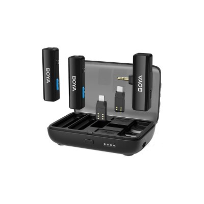 BOYA LINK 是全面无线降噪收音系统,包括两个发射器、一个接收器和三种不同类型的接收器(Type-C、Lightning、3.5mm TRS 连接器),全面覆盖手机/相机/电脑等所有设备!并提供充电保护盒便携且易于长时间使用。