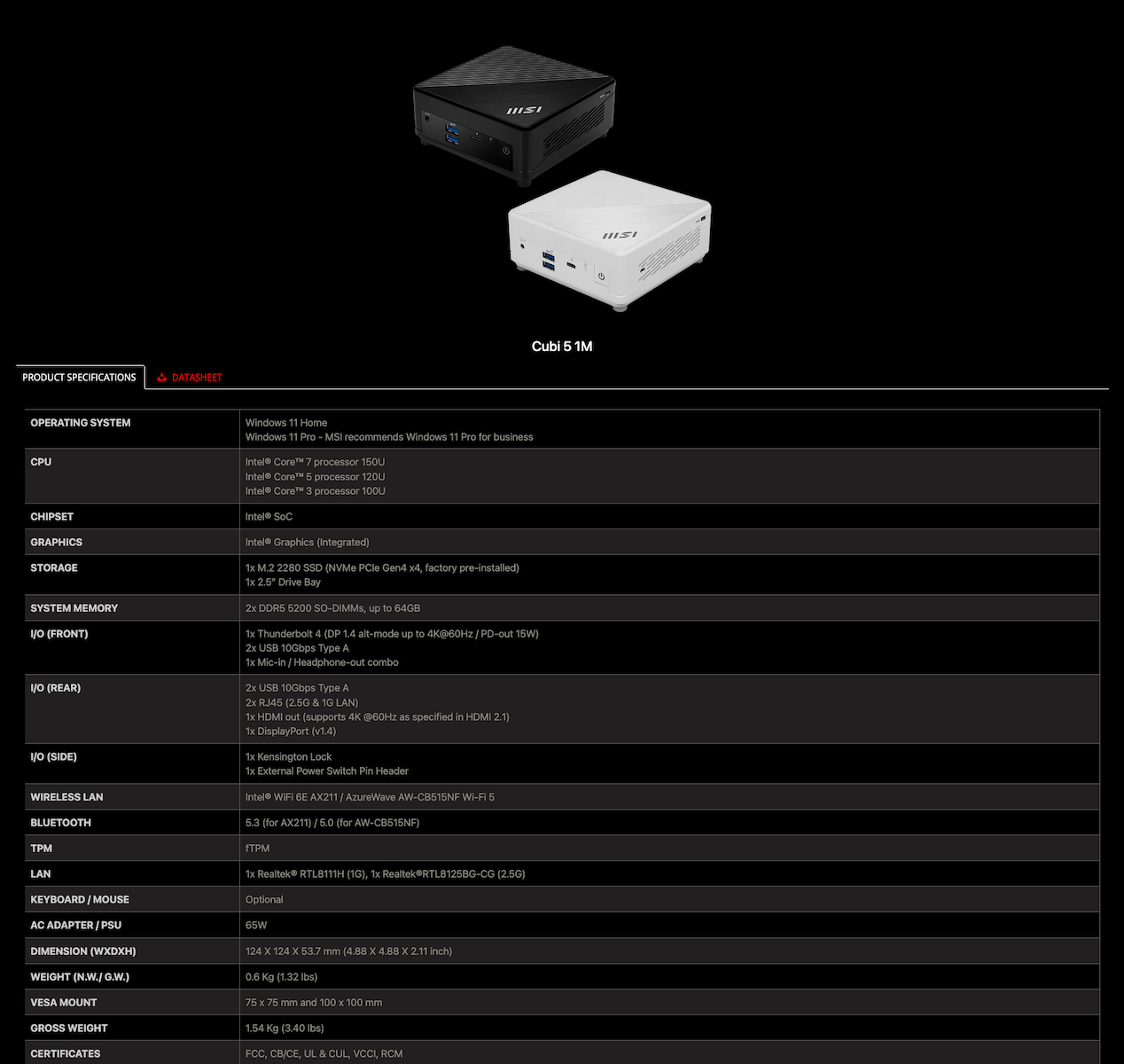 Cubi 5 是一款专为商务使用者设计的迷你电脑。它配备Thunderbolt 连接埠,可外接最高3 个显示器,并支援MSI Power Link 和Power Meter。轻巧体积支援VESA安装.