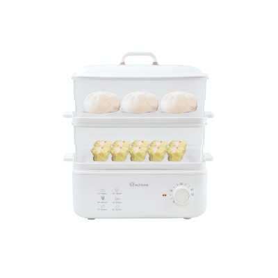 可拆式蒸隔层板/ 高功率快速蒸气/ 时间掣5–50分钟/ 旋钮式控制键/ 缺水或过热自动断电/ 1L特大水箱/ 单层或双层使用/ 耐高温材质/ 聚能立体环绕加热, 水滴不会滴落食物/ 方形蒸笼, 容量更大/ 2层透明蒸格, 可叠收纳悭位