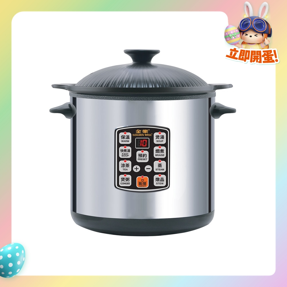 内锅采用天然陶瓷原料,经高温烧制而成,烹调食物更富健康美味。多种烹调功能,适用于老火汤、煲粥、焖煮、炖品、姜醋。预约时间功能,令烹调更省时便利。增设广东话语音提示。