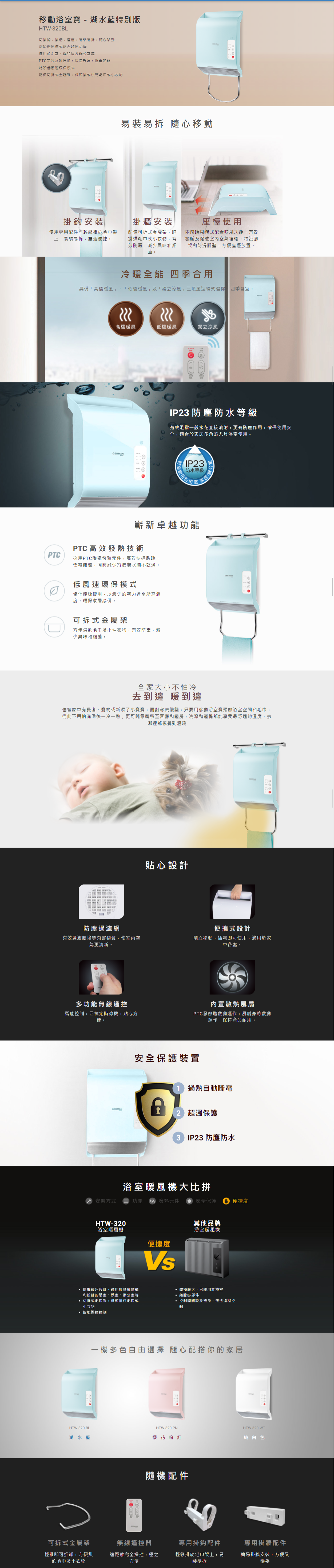可挂钩、挂墙、座台,易装易拆,随心移动/ 两段暖风模式配合吹风功能/ 适用于浴室、婴儿房及办公室等/ PTC高效发热技术,快速制暖,悭电节能