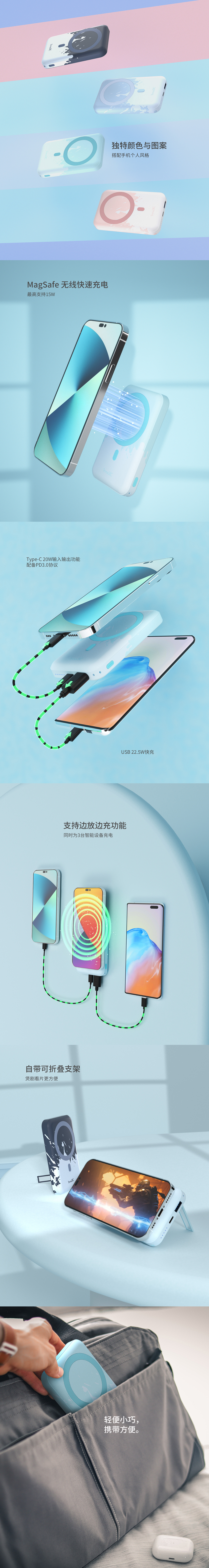 1. 本公司外观专利产品。2. 时尚独特图案设计。3. 支持MagSafe 磁吸充电功能。4. 支持15W无线快速充电。5. Type-C Port支持最高20W快充输出及最高18W快充输入,配备Power Delivery (PD3.0) 协议,并支持最新的iPhone / Android Phone和其他快速充电设备。6. 全兼容快充USB支援高达 22.5W输出,支援华为SCP超级快充及绝大部分快充手机。7. 10000mAh聚合物移动电源,体积小薄身轻巧。