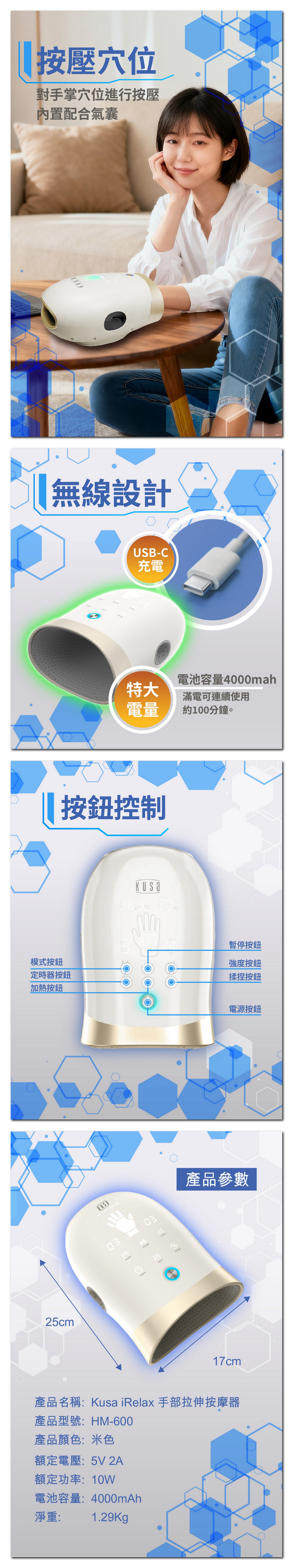 Kusa iRelax HM-600 手部拉伸按摩器集气囊按压、指压按摩、手指拉伸及温热护理于一身,全面呵护双手。内置LCD显示屏,操作状态清晰易明。独立指部气囊可细致按摩每根手指,配合手掌及手腕全面气囊包覆,有效促进血液循环并提升指关节灵活度。设有高低两文件加热温度,舒缓手部僵硬与疲劳。无线设计配合智能定时功能,使用更方便安心。内置4000mAh电池,充满电可连续使用约4小时,适合上班族、家庭主妇及手工艺者日常放松双手。