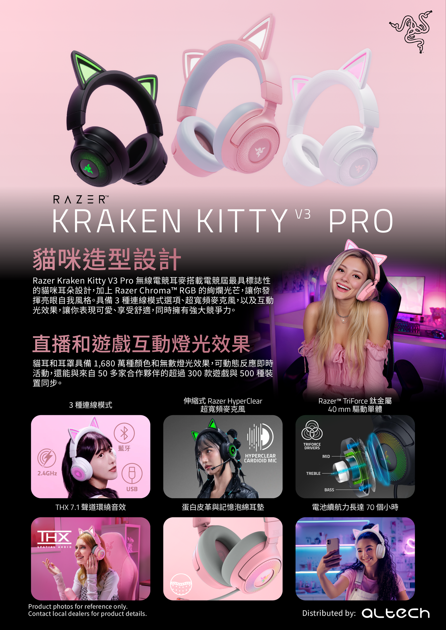 Razer Kraken Kitty V3 Pro 无线电竞耳麦搭载电竞届最具标志性的猫咪耳朵设计,加上 Razer Chroma™ RGB 的绚烂光芒,让你发挥亮眼自我风格。具备 3 种连线模式选项、超宽频麦克风,以及互动光效果,让你表现可爱、享受舒适,同时拥有强大竞争力。