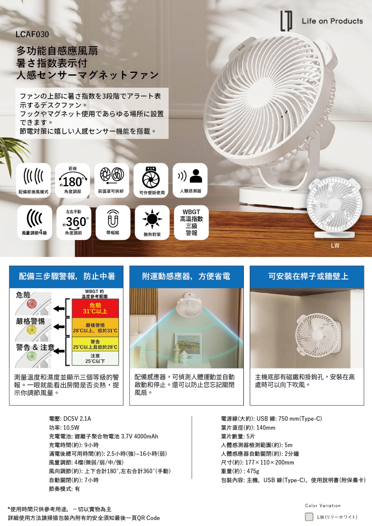 日本Life on Products LCAF030多功能自感应风扇,一部带三级热指数警报的多功能自感应风扇,在炎炎夏日为你示警。一机多用,可作座枱/壁挂使用,三级热指数警报,可助您实时了解环境温度变化,搭配运动感应功能,自动启停更省电,电池容量高达4000mAh,最高可用16小时(最低风速),4段风速可供选择风力强劲,在夏日为您护航