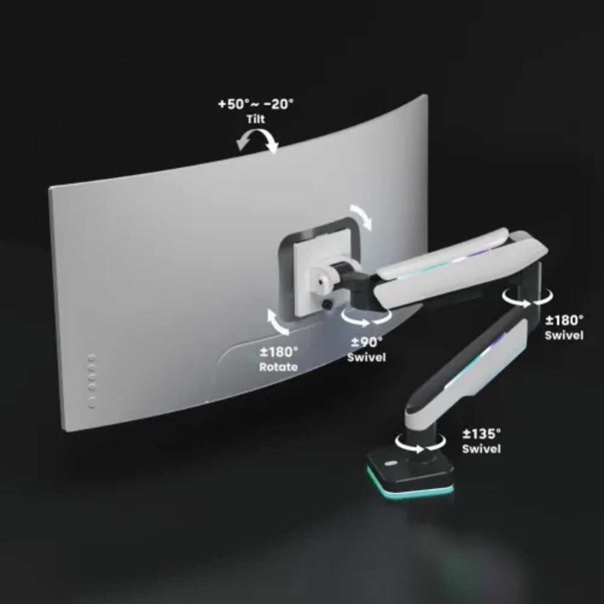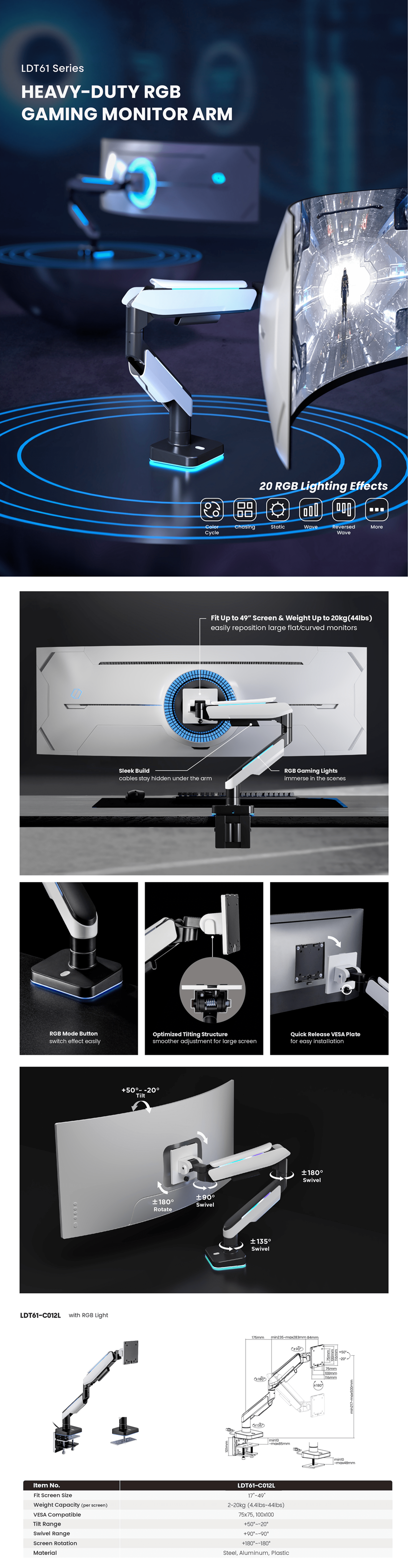 支撑重量高达 44 磅:轻鬆重新定位大型曲面/平面显示器/可拆卸VESA板设计:安装方便/内建开关按钮:轻鬆控制灯光模式/酷炫的灯光效果