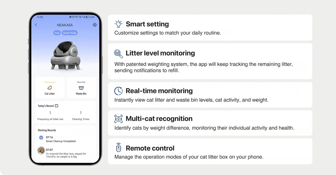 作为第一款为大猫、胖猫设计的开放式智慧猫砂盆,更符合猫咪的生活习性,且不论从哪个角度靠近,都能顺利进入Neakasa M1 自在地解放。把 360° 环景视野还给猫咪,饲主也不错过毛孩的一举一动