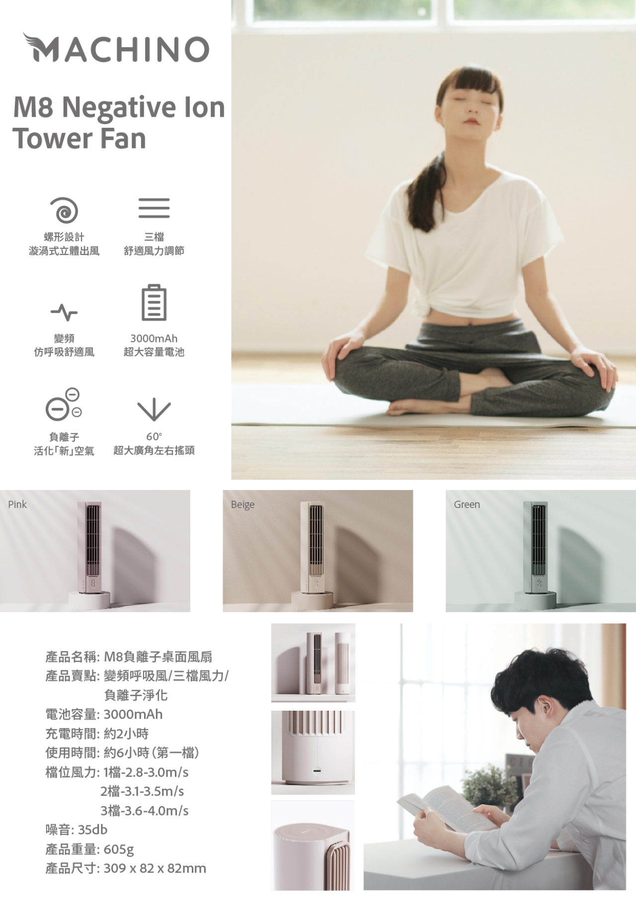 独特型格圆柱座枱设计,悭位易用- 内置负离子净化空气- 3段风速调校:低/中/高- 3种模式:常风/自然风/睡眠风- 60 度广角度摇头,自由调节送风角度-可拆除网罩,清洁容易- 静音设计,只有35dB - 内置3000mAh , 无线使用可达6 小时