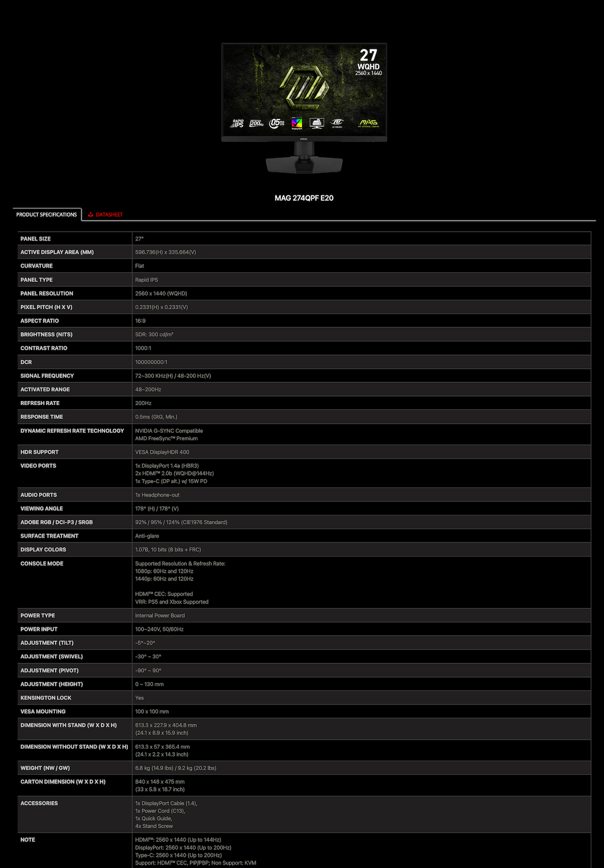 MSI 微星 MAG 274QPF E20 27" 2K 200Hz Rapid IPS 电竞显示屏
