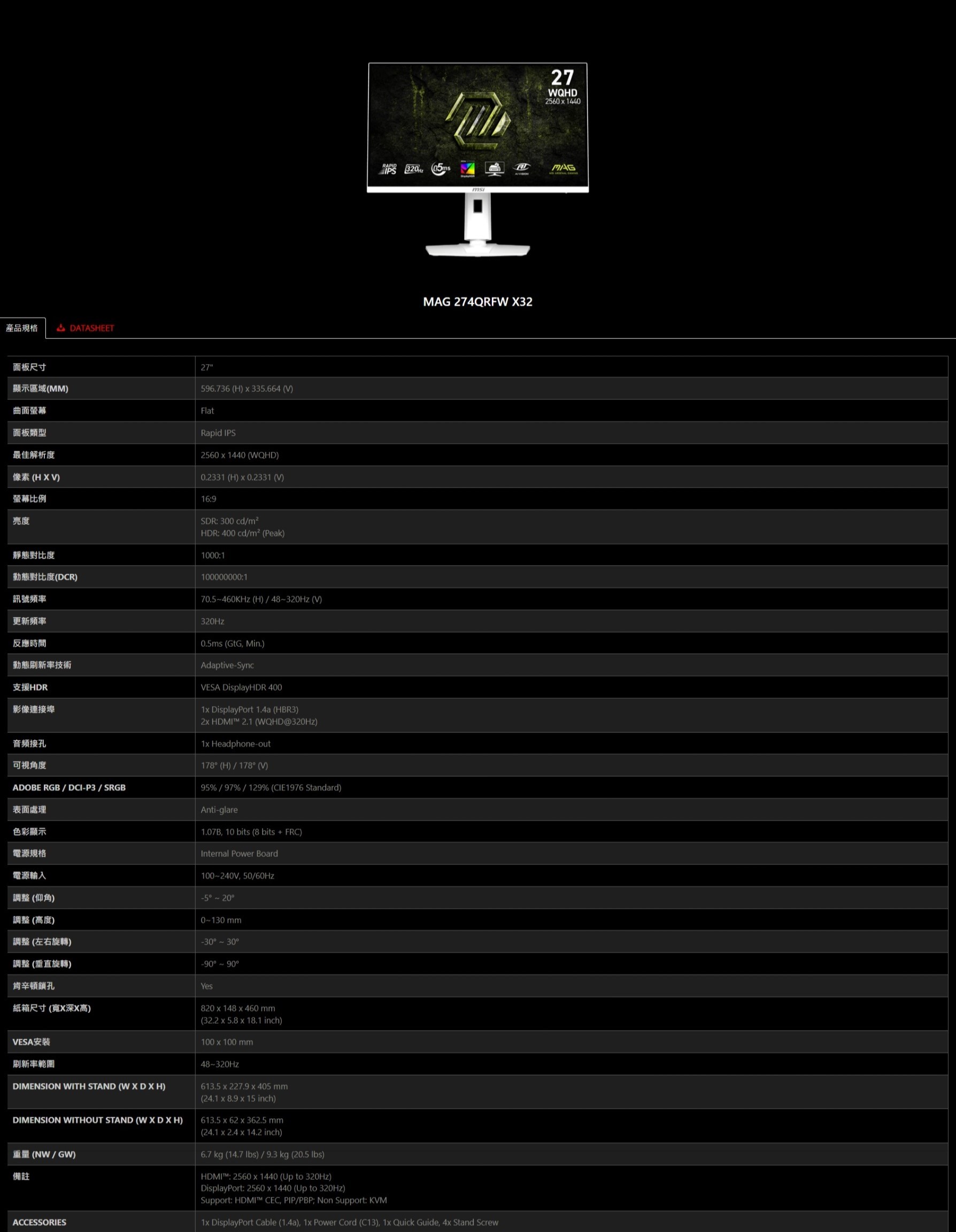 Rapid IPS/WQHD High Resolution/320Hz Refresh Rate/0.5ms (GtG, Min.)/Adjustable Stand/VESA DisplayHDR 400/DCI-P3 97% / sRGB 129%