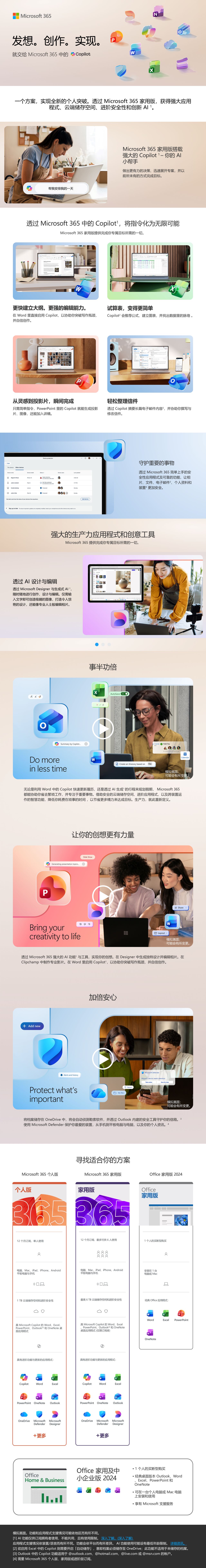 更上一层楼的 Microsoft 365 — 让 Microsoft 365 中新增的 Copilot 功能*助你一臂之力。Microsoft 365 家用版可供 6 个用户使用,Word、Excel、PowerPoint 和 Outlook 的进阶版本,1TB OneDrive 云端储存空间以备份档案和相片,适用于 Windows、macOS、iOS 和Android (*AI功能仅供订阅拥有者使用,无法共用/具有使用限制。)