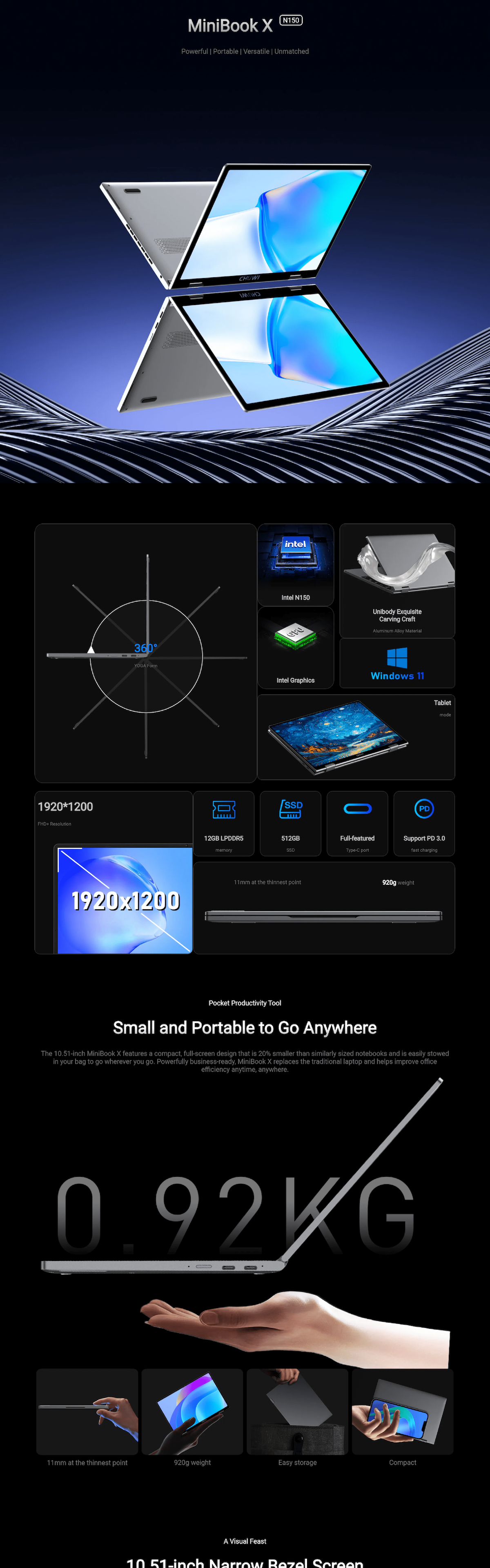 Yoga & Touch Screen/10.51" 1200*1920, 16:10 IPS/Intel Processor N150 with Intel® Graphics/16GB RAM + 512GB SSD/WIFI6(802.11ax1), BT5.2/28.88Wh (7.6V/3800mAh)/Windows 11 Home