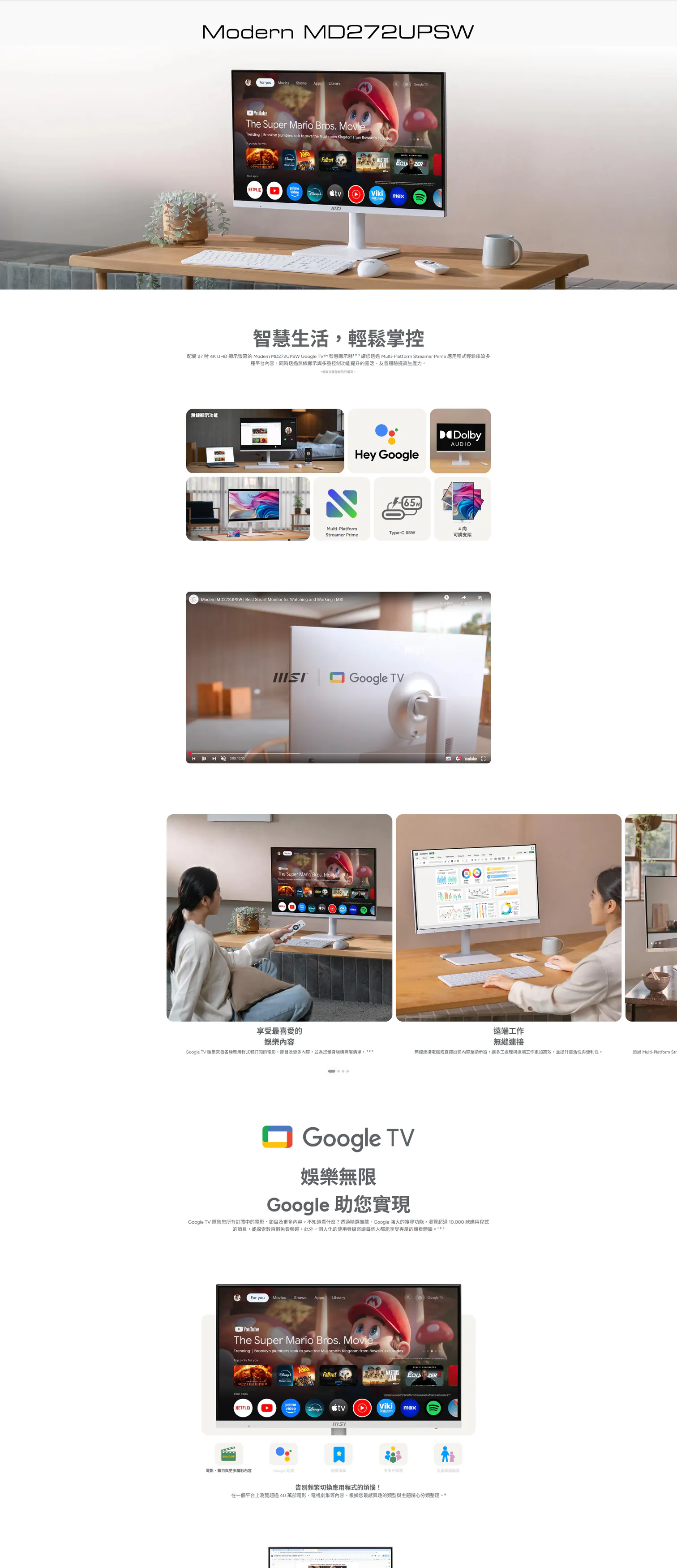 Google TV/4K UHD 3840 x 2160/60Hz Refresh Rate/Type-C (DP Alt.) w/ 65W PD/Dolby Audio/Energy Star certified/Less blue light and anti-flicker technology/DCI-P3 98% , Adobe RGB 94% , sRGB 127%