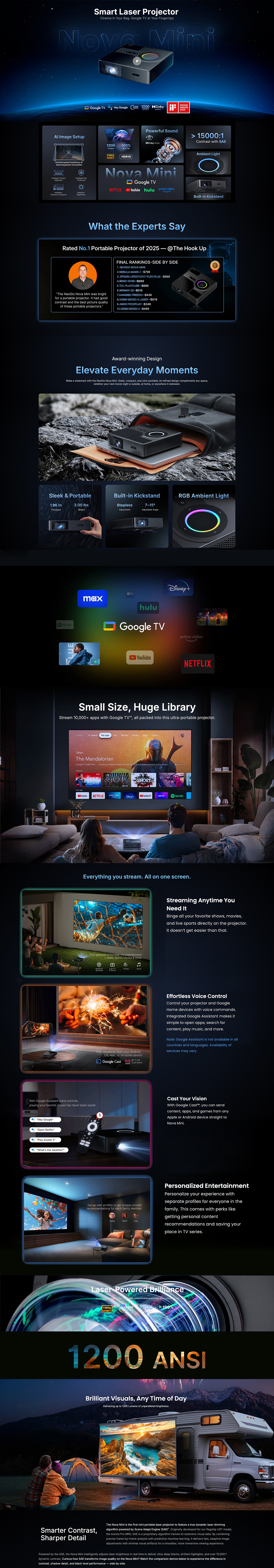 Nova Mini雷射投影流明高达1200 ANSI,色域为100% Rec.709,并支援HDR10和HLG技术原始分辨率1080P。投射比例为1.2:1,动态对比:>15000:1,可提供卓越的影像深度和细节。可投射尺寸60″-150″,支援3D电影投放,配备8W立体声扬声器,支援Dolby Audio。内建Google TV提供香港常用串流服务,包括Netflix、YouTube、Disney+等,所有操作均可透过内建语音控制的直觉式遥控器完成。