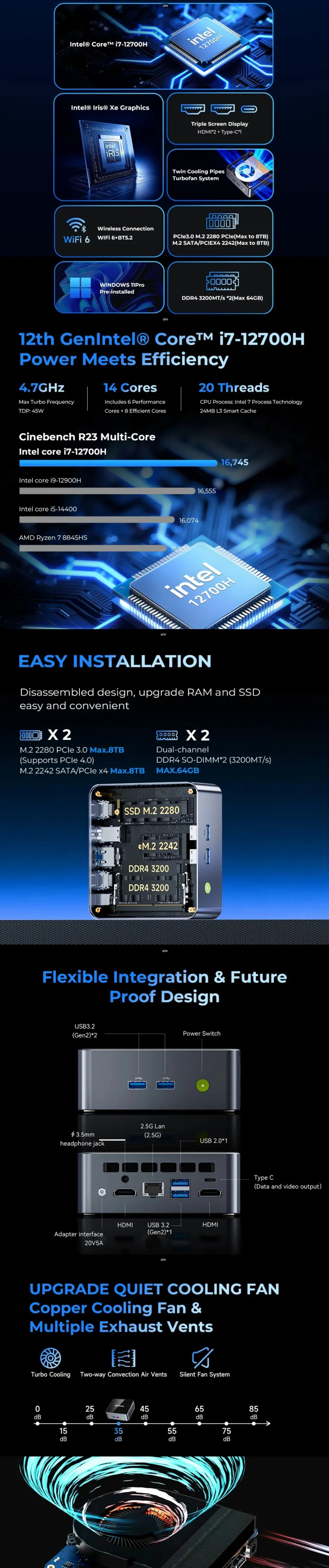Intel® Core™ i7-12700H CPU/Intel® Iris® Xe Graphics/32GB DDR4-3200 memory/1TB M.2 2280 NVMe (PCIe 3.0) SSD/HDMI (2.0) x 2, USB Type-C x 1 Triple displays/2.5Gb LAN, WiFi-6 & Bluetooth 5.2/USB 3.2 Gen 2 & USB 2.0 ports/Windows 11 Pro