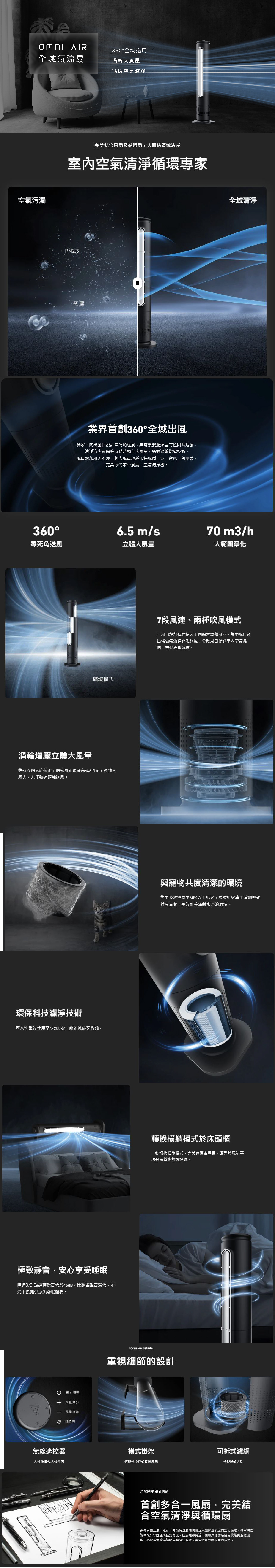 独家三向出风口设计零死角送风,无需频繁摆头,清淨凉爽,搭载涡轮增压技术,一部抵三部风扇,更内附集尘毛髮滤网,完美取代家中风扇、空气清淨机。OMNI AIR 有7段风速三风口设计,可依照不同需求调整风向,一机同时照顾家中每个成员,分散风口可促进室内空气循环,带动周围气流。机身独特设计可直立亦可一秒切换至横躺模式,完美迎合多个使用埸景