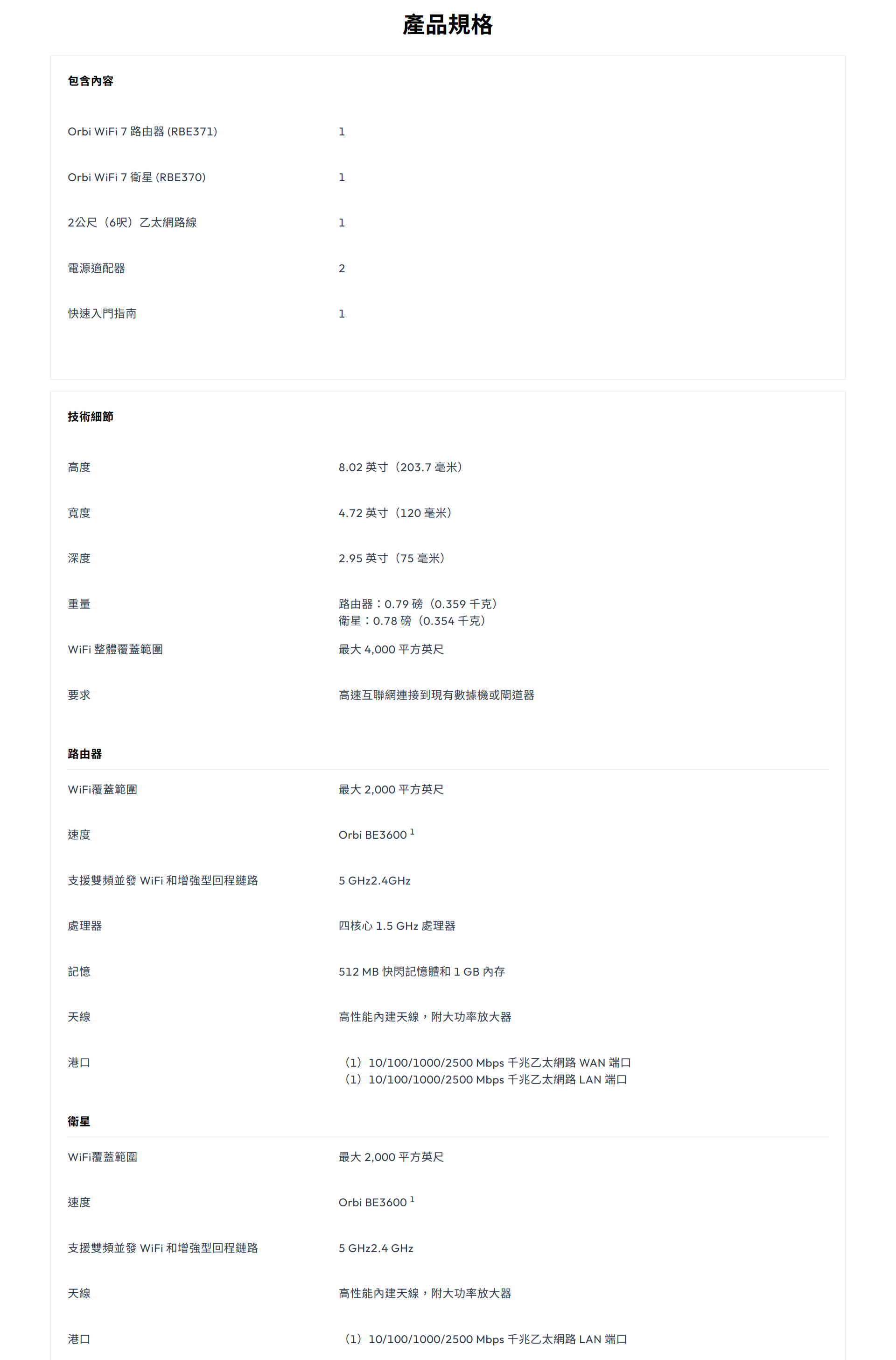 NETGEAR Orbi RBE372 双频 BE3600 Mesh WiFi 7 无线系统 (两件装)