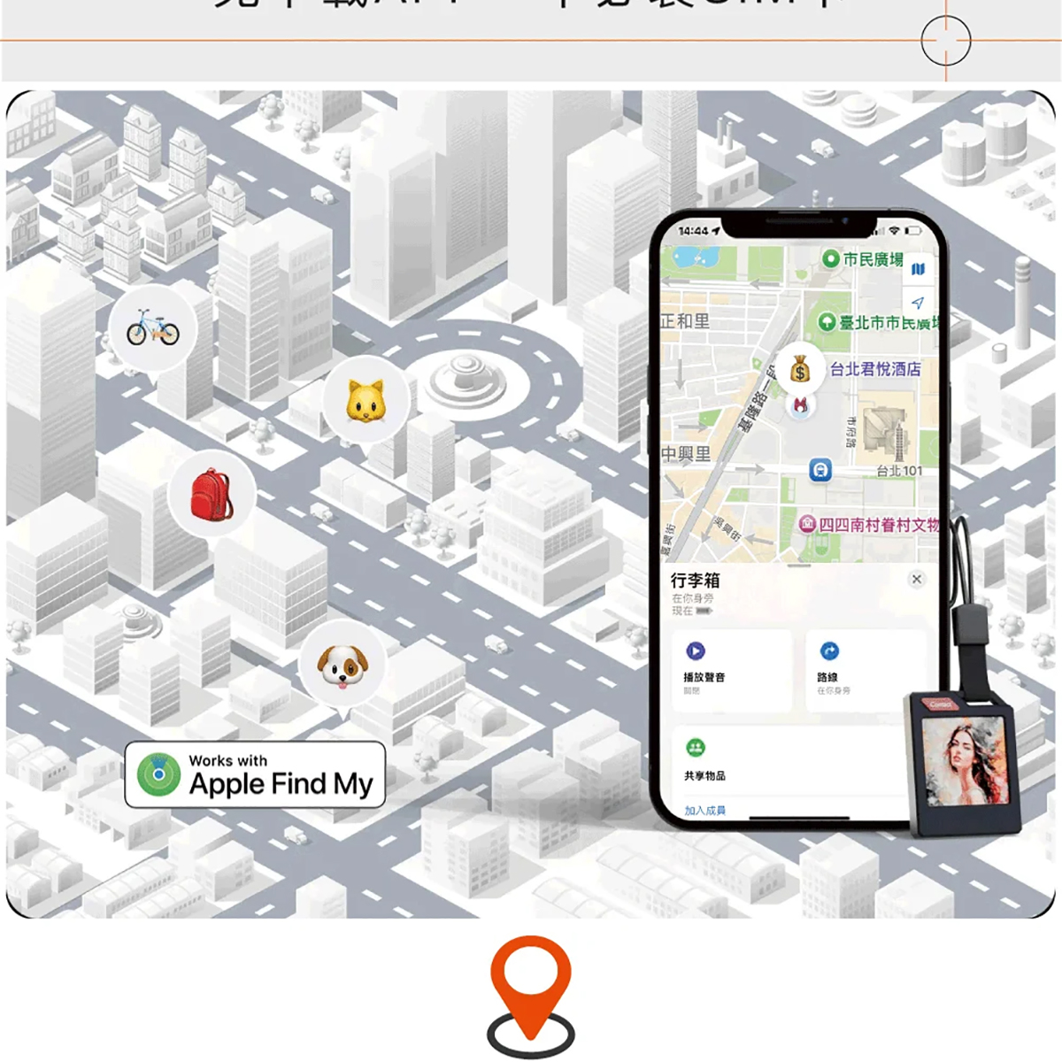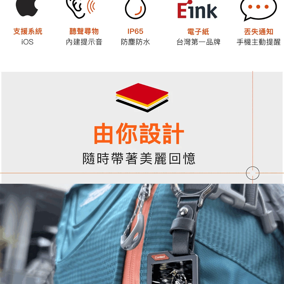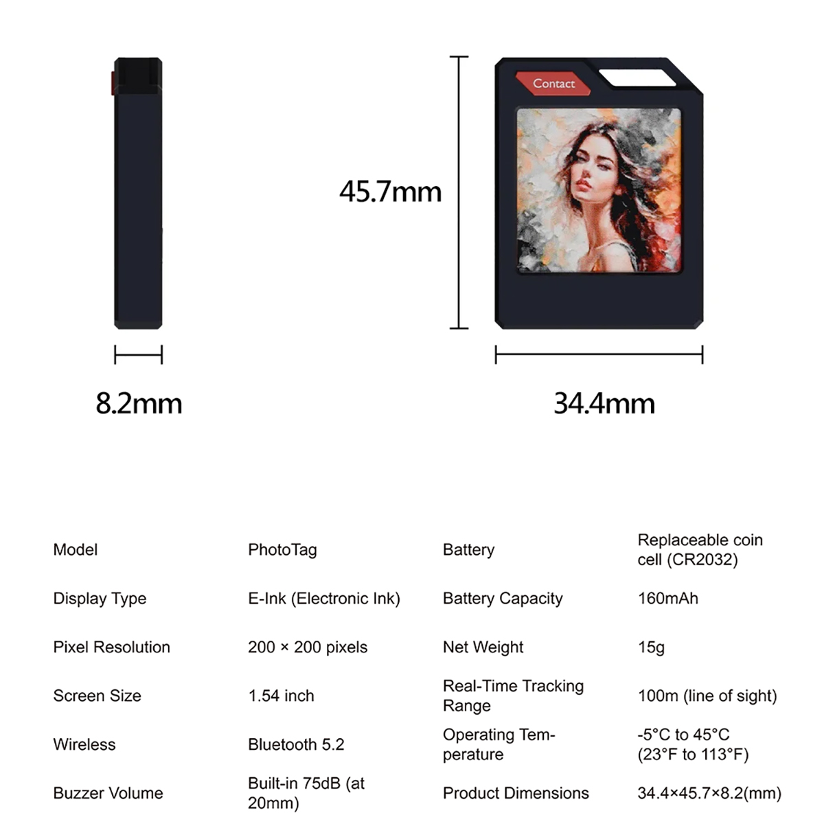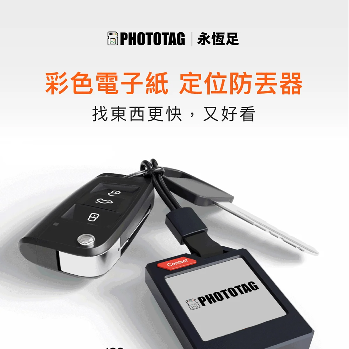 照片或电子名片一键切换, 可上传喜爱的照片, 自订电子名片标签文字, 手机专属PhotoTag App,内置图片编辑功能, 内置 E-Ink 四色电子纸, 可带上飞机,可挂在随身行李或放在行李箱托运, 全球定位追踪,助你快速找到遗失物品, 定位资讯加密保护, 物品离身通知,内置提示音,引导你轻松找到遗失物品, 可将 PhotoTag的位置最多共享给通讯录5个联络人, 高达10个月的使用时间, IP65防尘防水,可抵御雨水、水溅和意外泼溅, 支持 iOS 装置系统, 轻巧便携
