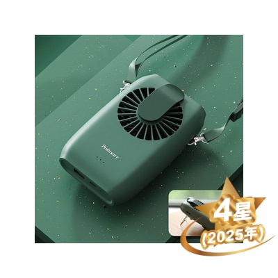 普乐氏 PHF001200G USB 迷你可挂式充电风扇。多种使用方式:挂在颈上、挂腰、载在手腕上、放在桌面上。向上出风设计,可配戴使用。体积小巧,轻鬆装入手袋和背包。具备三档风速和2000mAh 电池容量。材料为ABS,淨重160g。附送配件:挂绳、支架、手环扣和充电线。