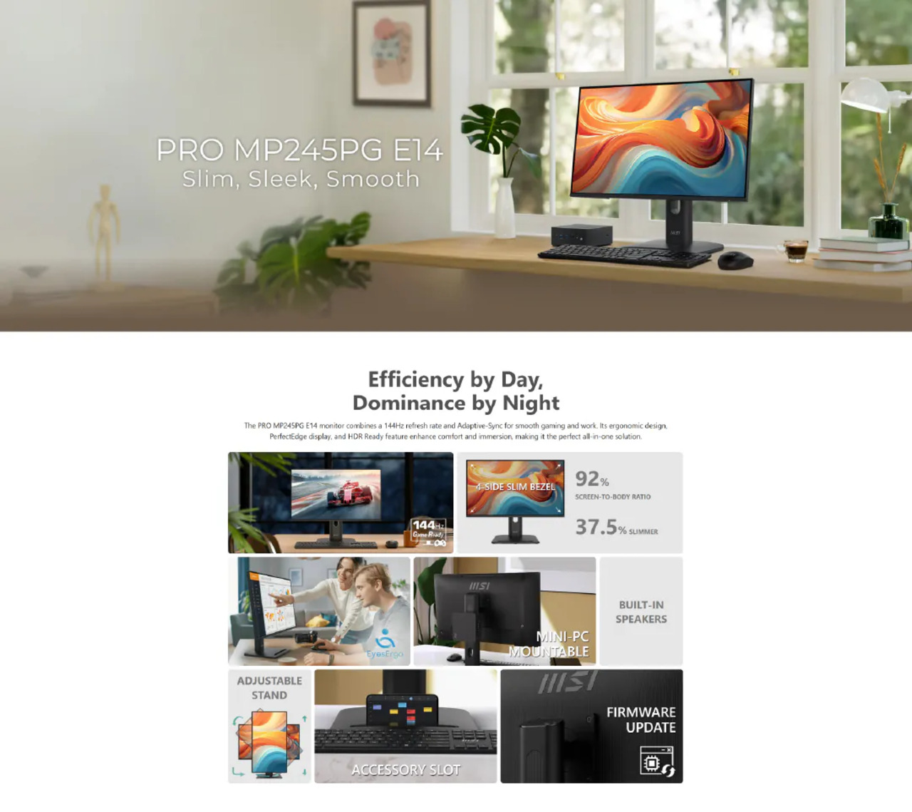 四边轻薄窄边框设计/流畅144Hz高更新率/24.5吋宽视角显示器/TÜV 护眼认证/MSI EyesErgo 与防闪烁技术,防止眼睛疲劳/MSI Eye-Q Check护眼提醒设计/拥有HDMI™ 1.4 、 DisplayPort 2.0 、D-Sub (VGA) 连接埠/採用方便且可拆卸的线材收纳设计/支援VESA标準安装/内建2个喇叭