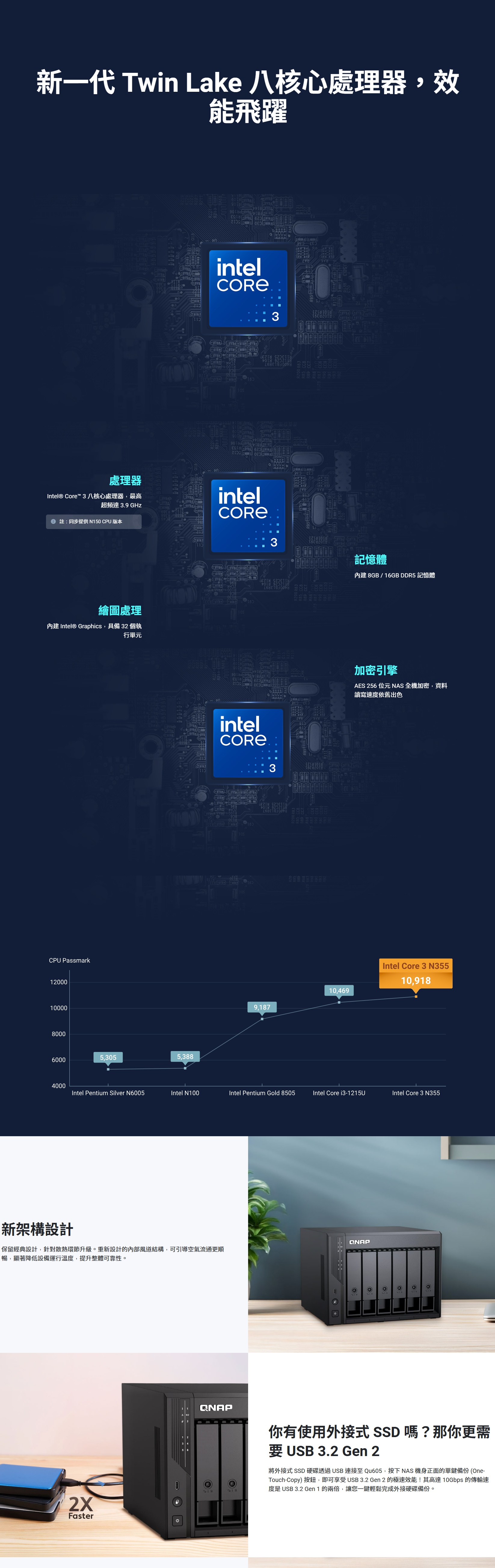 Qu605 搭载新一代N150 四核心处理器,支援 AES-NI 硬体加速加密引擎,内建 GPU 加速影片转档,提供高效可靠的资料储存中心。 Qu605 采用 DDR5 记忆体,最高可弹性扩充至 16GB;内建 2 个 M.2 PCIe Gen 3 插槽,可配置双 M.2 NVMe SSD 作为高速储存池或快取加速