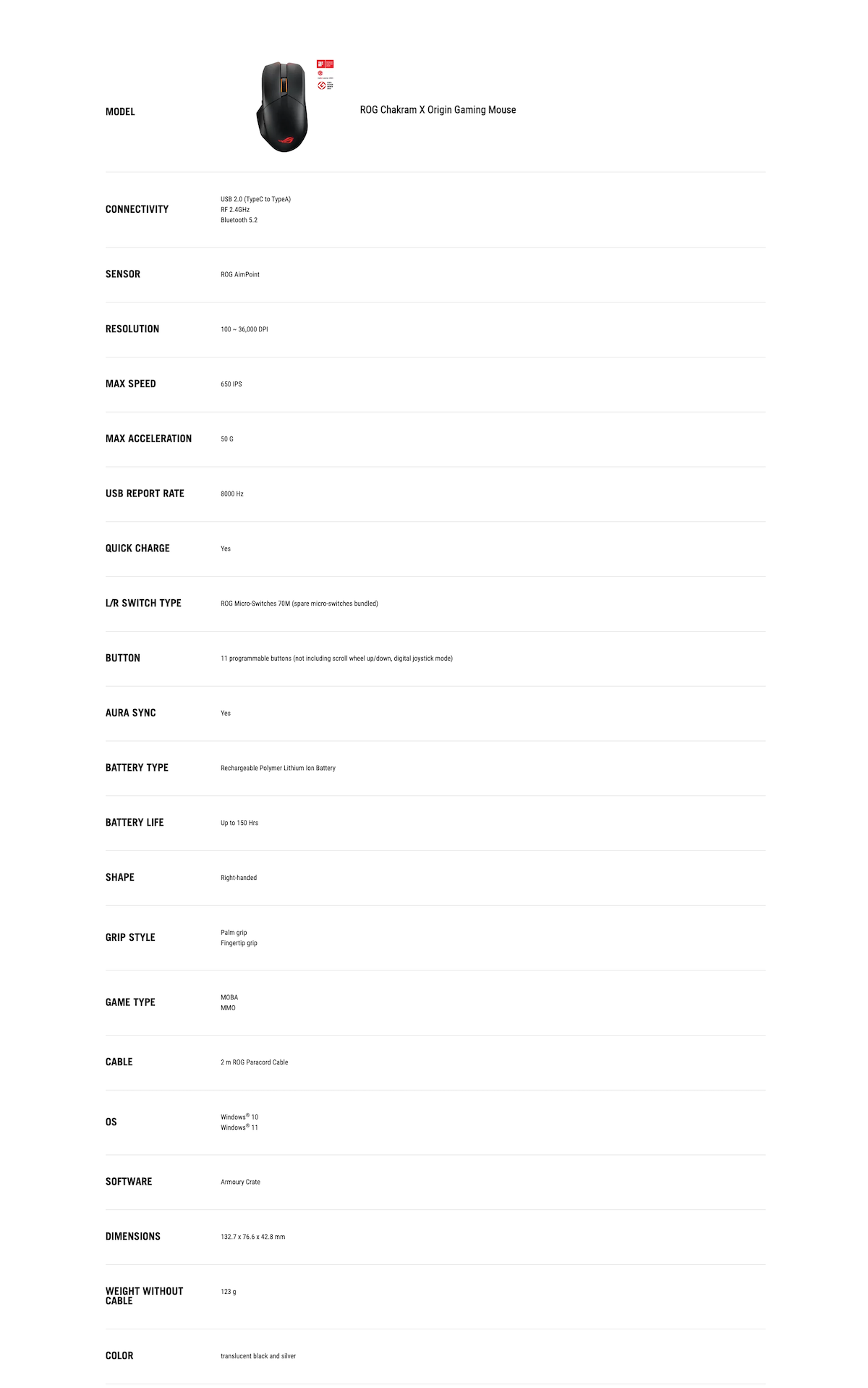 ROG Chakram X wireless RGB gaming mouse with next-gen 36,000 dpi ROG AimPoint optical sensor, 8000 Hz polling rate, low-latency tri-mode connectivity, 11 programmable buttons, an analog joystick and hot-swappable micro switch sockets.