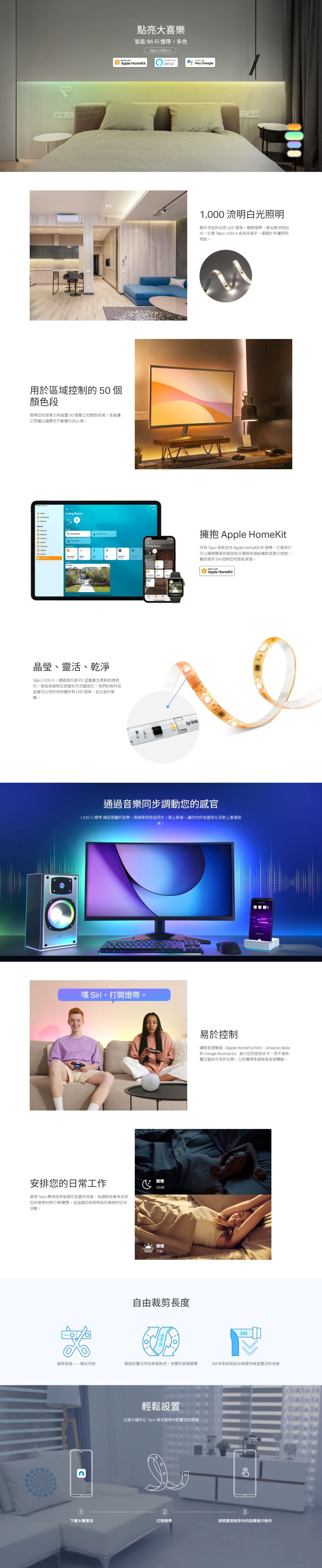 多场景预设,创建浪漫场景:最多50个不同颜色;多种炫彩呼吸灯效;可剪切,适应各种长度需求;PU涂层,安全防触电;音乐联动,伴随节律,多彩灯效变化;WiFi连接,Tapo App远程控制;支援Apple HomeKit, Alexa 、 Google Assistant,声音控制。